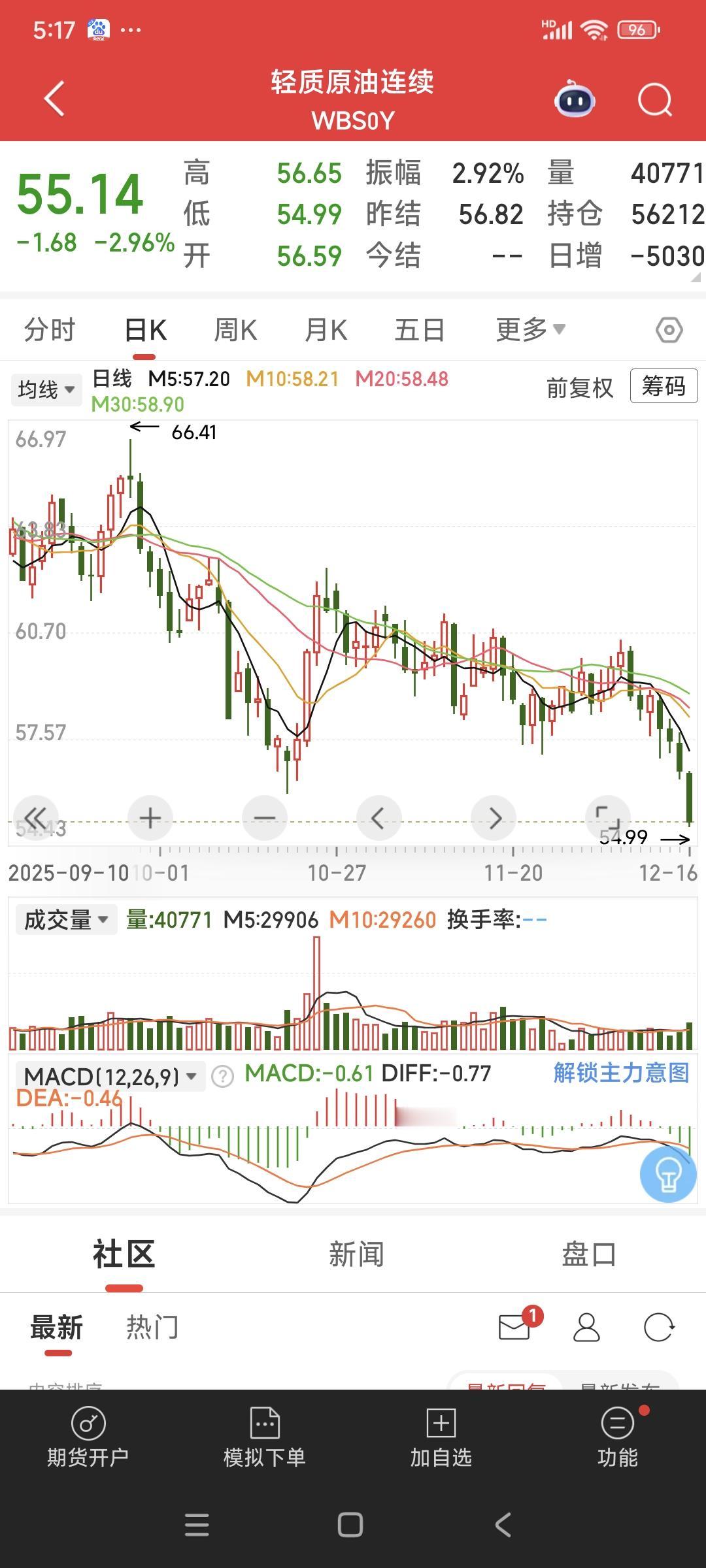 隔夜国际油价(轻质原油)跌破55,最低54.99。创5年新低了吧? 现在是北京时间12月17日5时17分,油价报55.14,跌幅为2.96% 对于我们老百姓来讲,开车加油是不是要便宜很多了?