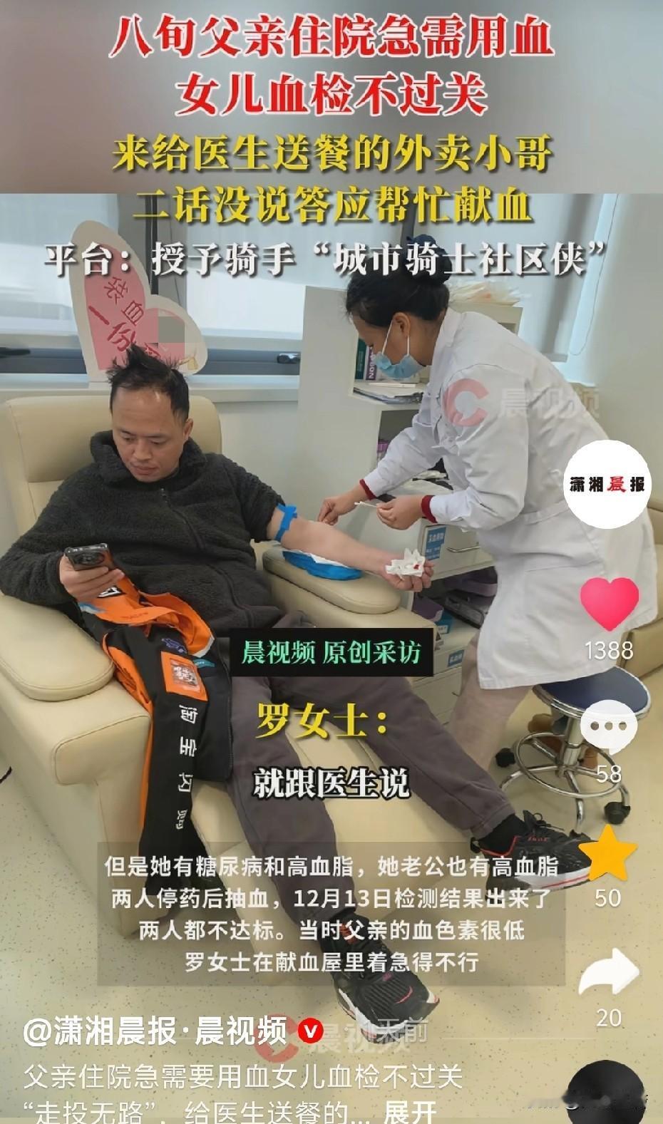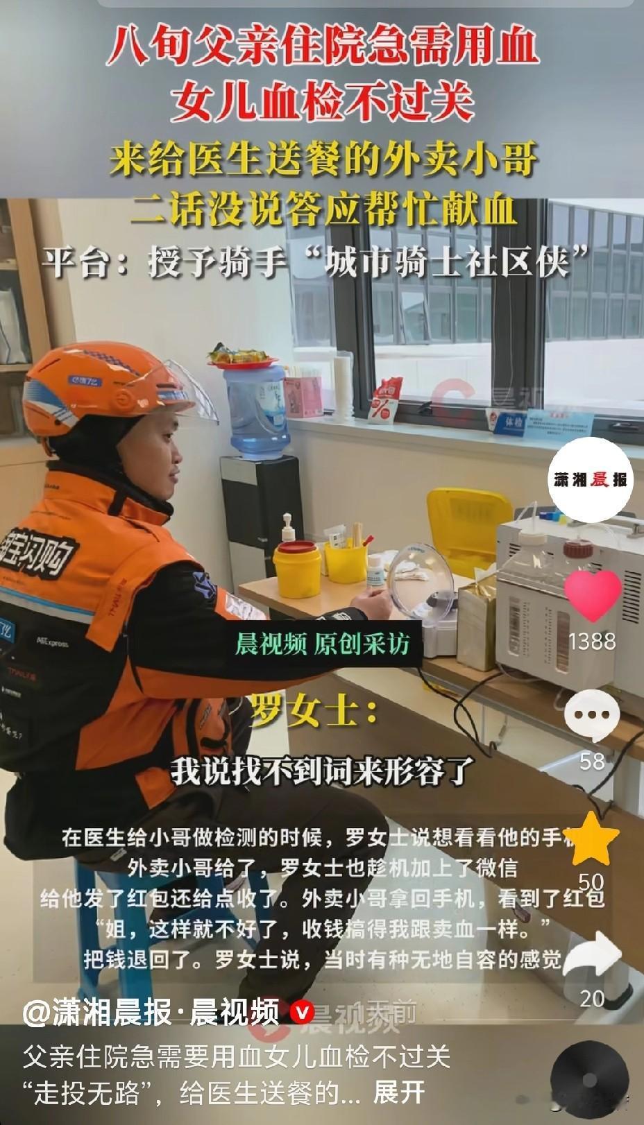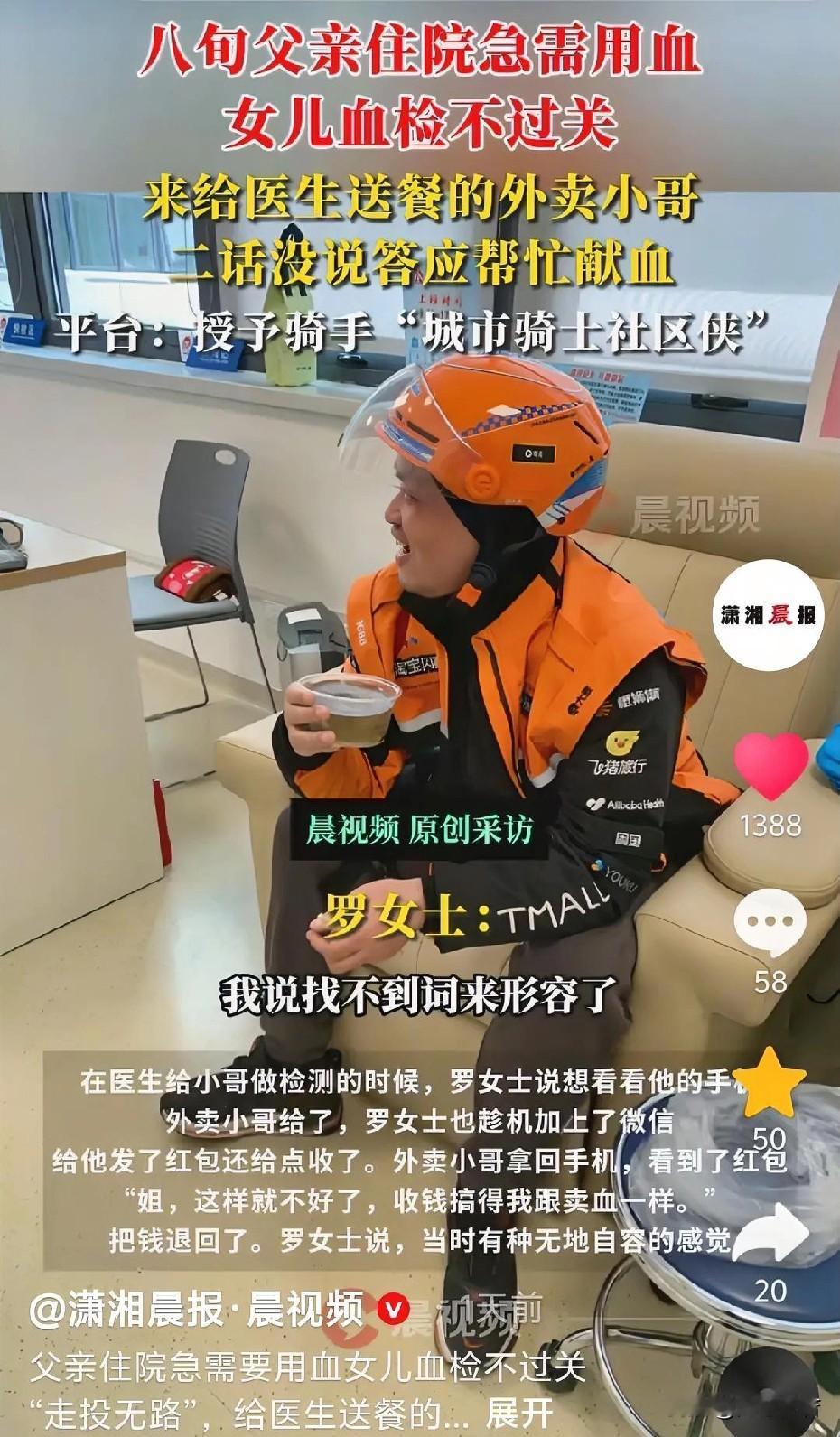近日,广西桂林,一名82岁的老人因病住院,期间由于重度贫血,医院通知家属前来献血,家人们纷纷从外地赶了回来。 女儿有糖尿病和高血脂,女婿也有高血脂,两人停药后抽血化验,12月13日检测结果出来了,医生告诉他们,你们两个人都不达标。而老人的血色素很低,女子在献血屋里急得团团转。 这时,一位外卖小哥来给献血屋的工作人员送餐。女子有点“疏离型人格”,但是当时不知怎么回事,就对外卖小哥说,“你能帮帮我吗?” 女子向小哥介绍了父亲的情况后,小哥简单问了一句,“你们在这里住院吗?”。在得到女子肯定的回答后,外卖小哥说可以。 他没有多说一句话就答应了,便坐下来跟医生说,他要帮女子的父亲献血。在医生给外卖小哥做检查的时候,女子说想看看小哥的手机。 外卖小哥把手机递给女子,她也趁机加上了微信,给小哥发了红包还给点收了。外卖小哥拿回手机,看到了红包,说姐,这样就不好了,收钱搞得我跟卖血一样。 随后,小哥把钱退给女子。 女子当时有点无地自容的感觉,等小哥献完血之后,说家里有小孩想送外卖锻炼一下,套到了外卖小哥队长的电话。女子联系了队长,队长说会汇报到站点,给外卖小哥表扬。之后,女子做了一面锦旗,打算过几天送去。平台授予小哥“城市骑士社区侠”称号。 看了视频,这位外卖小哥真的是骨子里的热心肠,只是送个餐的功夫,看到别人有生命攸关的难处,想都没想就答应献血,完全是出于本能的善意,没有一点犹豫和计较,这种陌生人之间的挺身而出,特别让人暖到心里。 小哥拒收红包的举动更戳人,他说“收钱搞得我跟卖血一样”,这话特别实在,也说明他帮忙根本不是为了钱,就是单纯想帮人,这份纯粹的善意比任何物质回报都珍贵,也让我们看到普通人身上最可贵的品质。 平台授予他“城市骑士社区侠”的称号也很到位,外卖小哥每天穿梭在城市里,不只是送外卖的劳动者,更是这座城市里的温暖纽带,这样的凡人壮举,也让我们相信身边总有不期而遇的美好。(来源:潇湘晨报.晨视频)