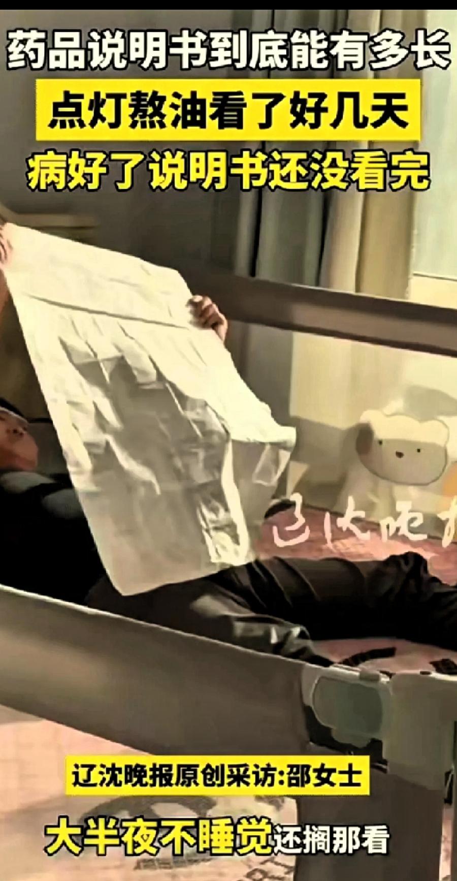 真的笑不活了! 辽宁一男子感冒了准备吃药,想看一下说明书,没想到一打开直接傻眼了,好家伙!这说明书比世界地图还大,跟“裹脚布”似的又臭又长,还别说这哥们真是个认真人,干脆做下来点灯熬油看了几天,病都快好了,说明书还没看完。别人不知道以为这大哥在“考博”呢! 其实不用考虑使用者的需求,简简单单就是什么时间吃?吃几次?吃多少?忌口什么?有什么不良反应?万事大吉。把不该写的什分子式,药理分析等等都去掉,这些专业术语谁看的懂啊!把药品质量提上去,把价格压下来,是对老百姓最好的实惠!别整哪些没有用的,大家觉得是不是这个道理?