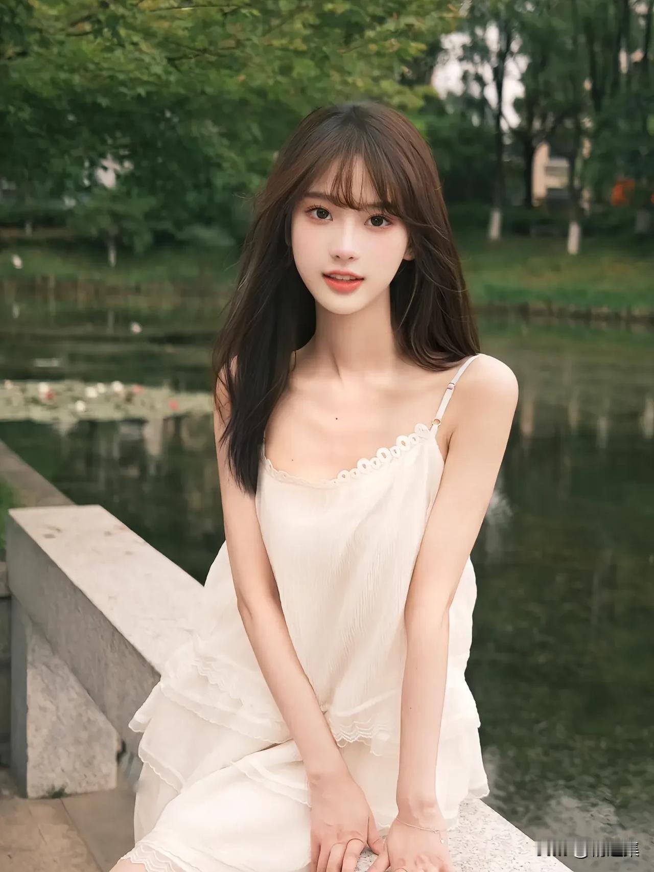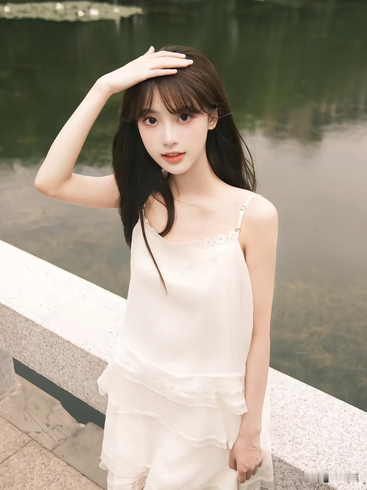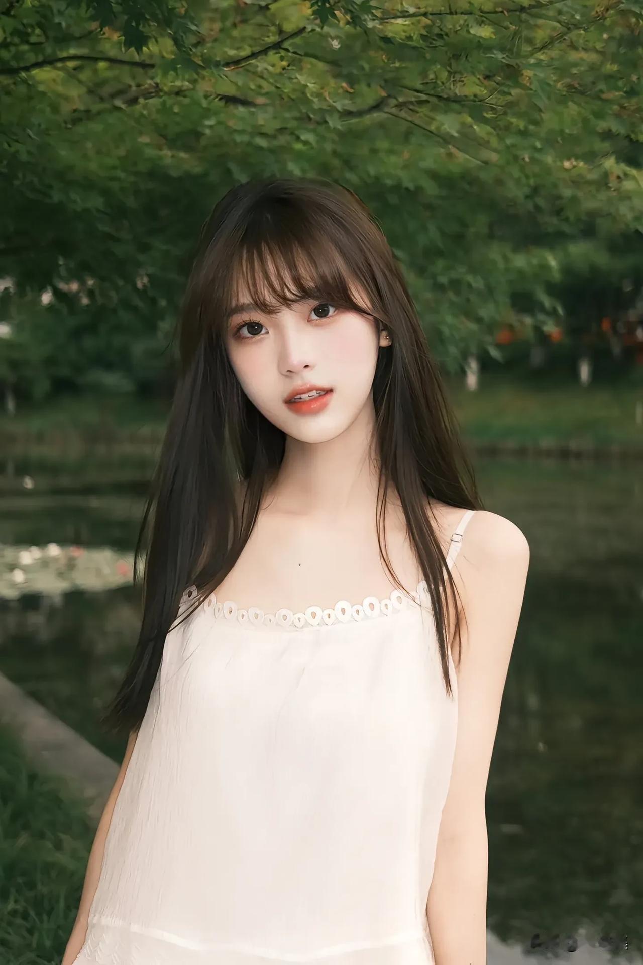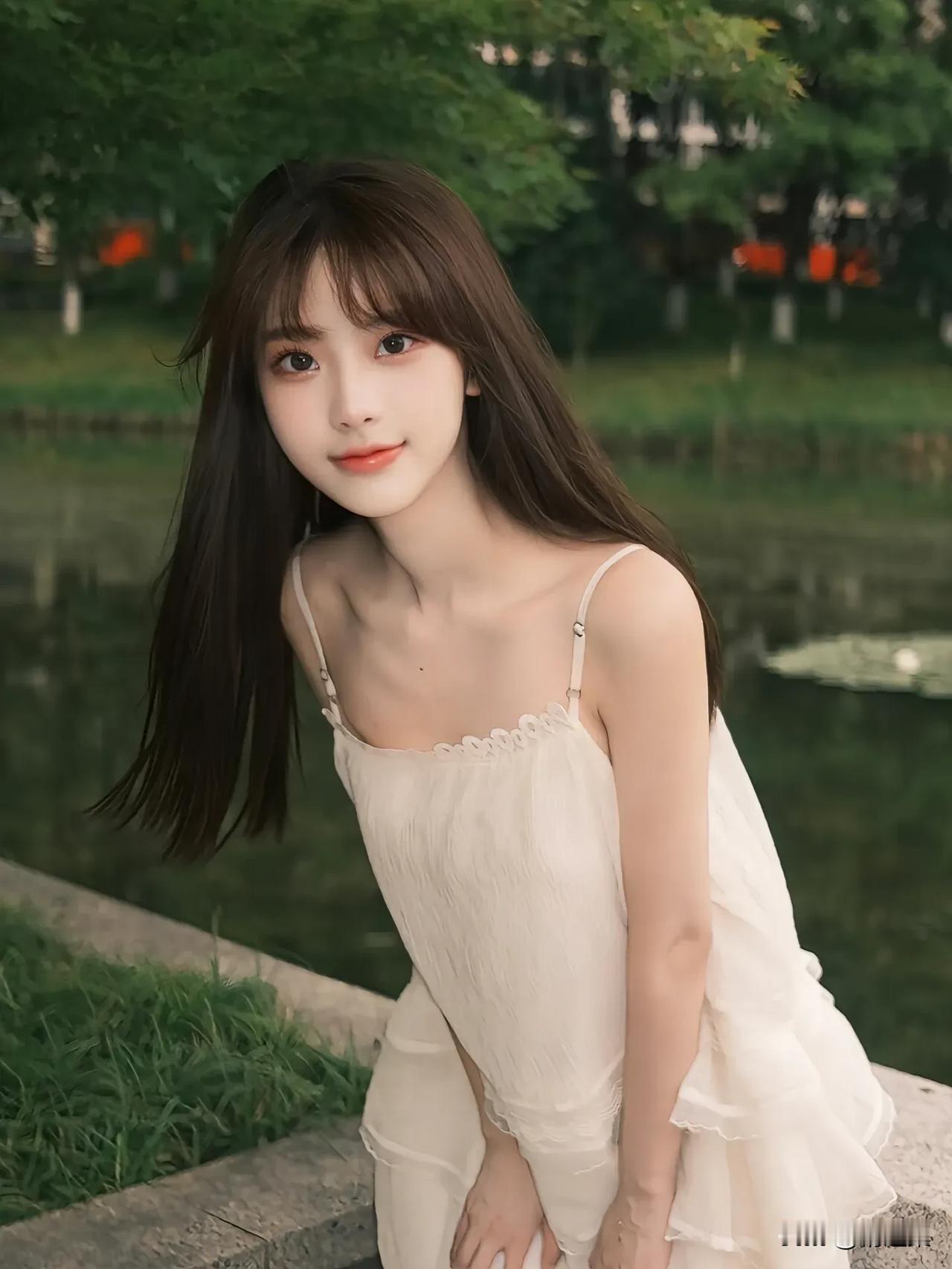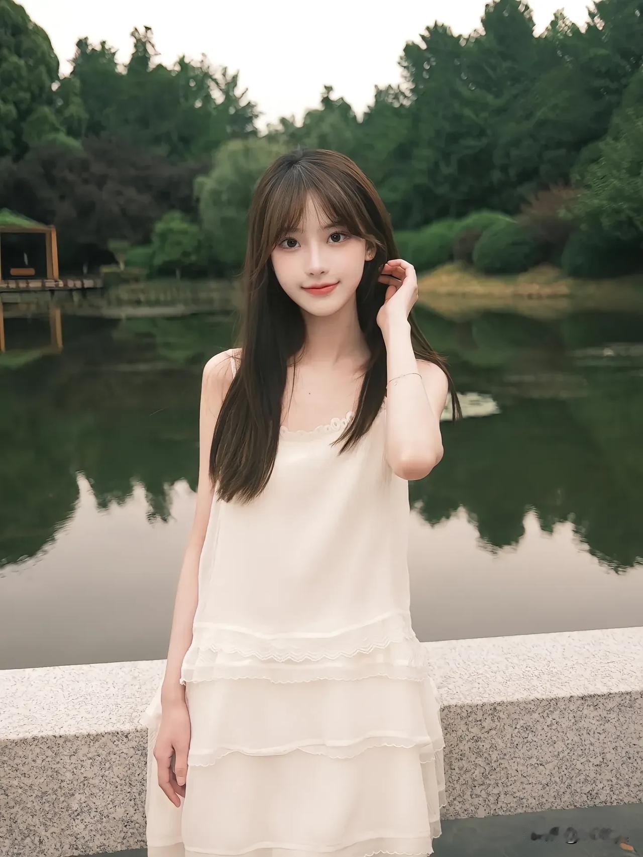 夏日清新少女,白色连衣裙,微笑面对镜头,背景是绿树和池塘。