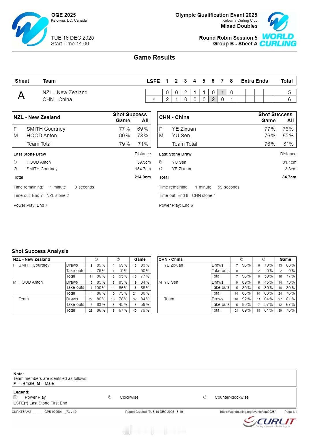 【冬奥冰壶落选赛中国混双五连胜独自领跑 澳大利亚负荷兰】冰壶混双资格赛中国队五连胜国际体坛战报速递12月15日加拿大基洛纳,冬奥冰壶落选赛混双小组赛B组,中国队在四五局连续被偷分的情况下,6-5险胜新西兰,取得五连胜独自领跑。本场中国队整体成功率要低于新西兰。本轮另一场关键战,四连胜的澳大利亚6-7遭用时仅剩8秒的荷兰绝杀,两队均4胜1负。A组五连胜的韩国已经提前晋级席位赛。北京时间18日凌晨2时,中国队将对阵五连败的西班牙。