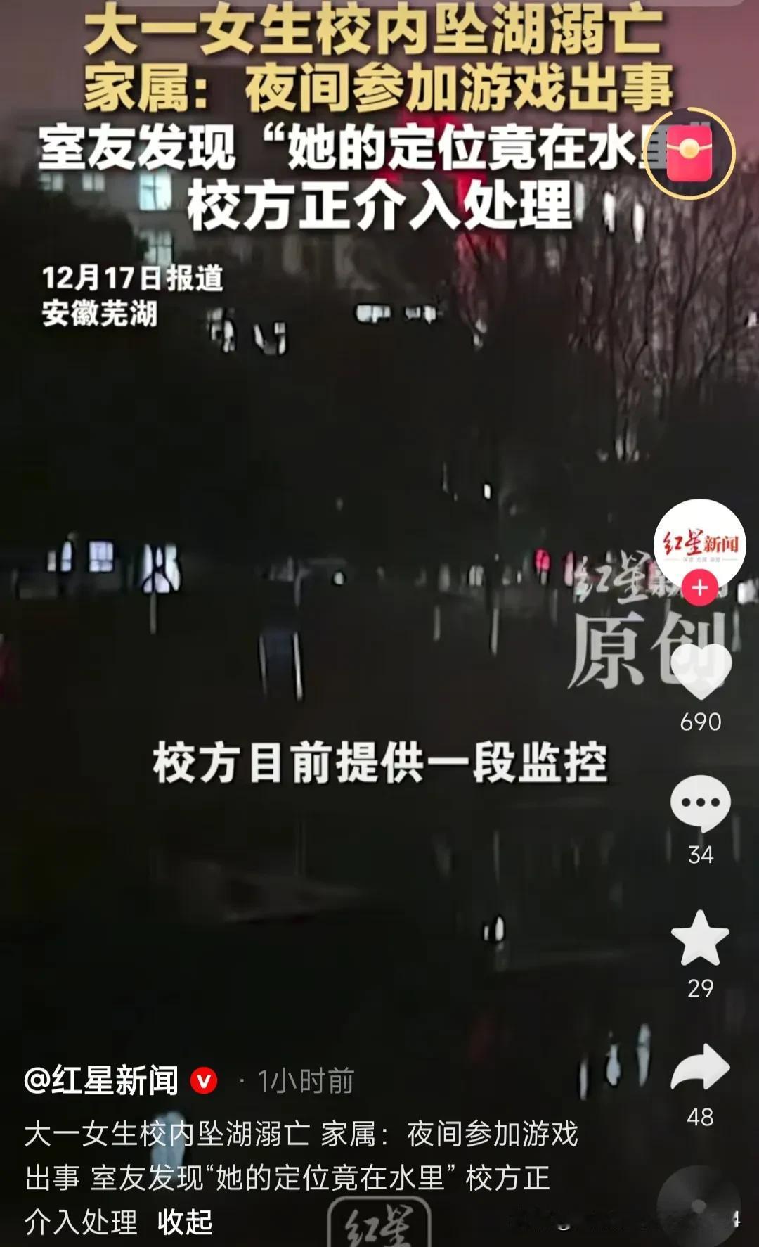 痛心,又出事了!大一女生晚上不慎落入校内湖中,由于路灯稀少、有些地方很暗,无人察觉最终溺亡! 据说还是寝室同学通过手机小游戏定位,发现她的定位竟然在水里! 有媒体报道说,家属称孩子是因为玩学校组织的“猫抓老鼠”游戏才不慎坠湖;但也有本校网友辟谣说,不是因为游戏,游戏是白天举办的。 事情发生于12月8日,安徽工程大学打造的“风行湖”水系。校方回应正在处理中。 这家长该哭死了,女孩才18岁,辛辛苦苦终于熬出头考上一本、实力排名都很不错的工程大学,结果才入学3个月就香消玉殒[蜡烛] 太可惜了![送自己一朵花][送自己一朵花]