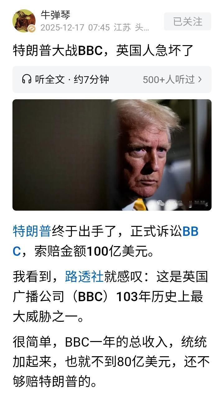 哈哈哈,恶人自有恶人磨,特朗普正式起诉BBC,索赔金额100亿美元。路透社感叹: