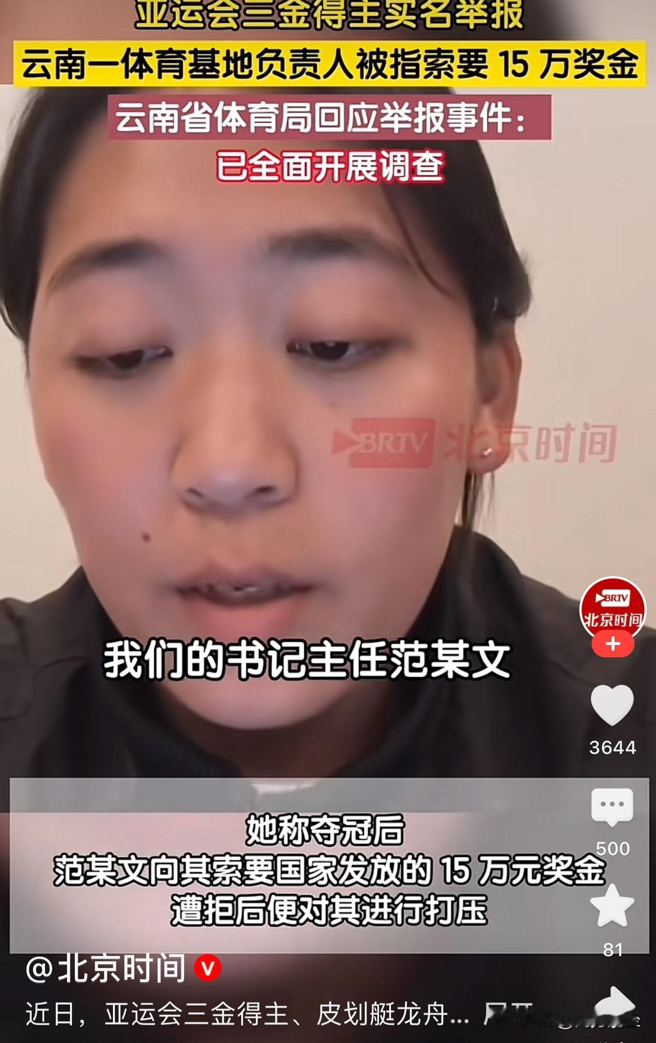 王莉被索要15万元奖金一事,首先需判断奖金的最终归属,明确其具体来源。 通常而言,不同来源的奖金,其分配归属情况有所不同: 一、商业赞助或捐赠类奖金 此类奖金是指个人或企业直接捐赠或赞助给运动员的奖金。 归属规则:个人不能直接接收,需通过官方协会(如中国奥委会、单项体育协会)接收,其中大部分(不低于70%)会奖励给运动员、教练员等有功人员。 二、劳动报酬类奖金 这类奖金主要是指运动员作为俱乐部或公司员工,因履行合同、取得比赛成绩而获得的工资、绩效和赢球奖金等。 归属规则:归属于运动员个人。 三、比赛成绩类奖金 这类奖金是指赛事主办方、体育管理部门等因运动员在比赛中取得名次而颁发的奖金,普遍被视为个人合法财产,但具体分配可能受国家、地方或所在单位的内部规定调整。例如,部分奖金可能按比例分配给培养单位或团队。 运动员王莉在2023年亚运会龙舟项目中获得的15万元奖金,其法律属性为国家发放给运动员个人的比赛奖金,是她作为运动员的合法个人财产。任何单位和个人索要该笔奖金均缺乏法律依据。 从王莉获奖的客观事实来看,首先明确了奖金来源:这是国家为表彰她在亚运会(龙舟项目)夺得三枚金牌而发放的比赛奖金。 当前纠纷:王莉实名举报其所在单位(云南省松茂体育训练基地)负责人范某文向她索要这笔15万元奖金。 因王莉未同意,她自称遭到了一系列不公正对待,断送了体育生涯。 官方回应:云南省体育局已于2025年12月15日发布通报,成立调查组全面开展调查。 调查状态:调查正在进行中,将依规依纪依法处理。