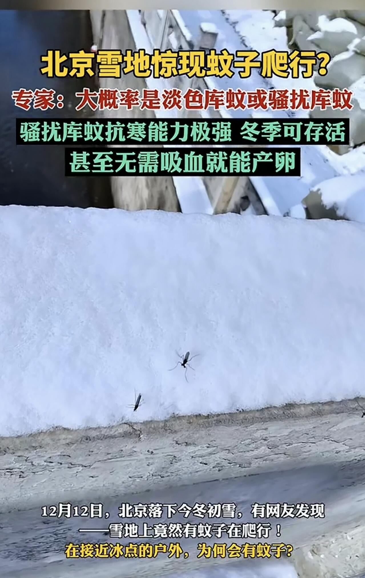 北京初雪刚上热搜,转眼就被雪地里的蚊子搞懵了! 网友拍的那画面,白雪上趴着一只蚊子还在慢慢爬,零下温度居然没冻死。北方人看完都傻了:“这蚊子是装了防冻液吗?”“雪天配蚊子,今年冬天简直魔幻!” 专家赶紧出来解释:这不是咱们夏天常见的那种蚊子,大概率是淡色库蚊或者骚扰库蚊,属于蚊子里的“抗冻王者”。它们平时冬天都躲在地下室、下水道这种暖和点儿的地方“睡觉”,最近不是气温来回跳嘛,加上城市热岛效应,这帮蚊子就晕了,以为春天到了,傻呵呵跑出来“晒太阳”,结果一上雪地就冻得飞不动,只能慢慢爬。 尤其是骚扰库蚊,这家伙更绝——抗寒能力点满,不吸血也能产卵,算是城市里全年无休的“加班蚊”。不过大伙儿也别太担心,它们这会儿冻得哆哆嗦嗦的,根本顾不上咬人,就是出来瞎溜达结果栽雪里了。 但这倒是提醒我们一件事:冬天室内那些积水可得清理干净,比如花盆底下的托盘、卫生间地漏、厨房水槽,别留静水。不然这些“越冬蚊”在暖气房里一暖和,没准儿真能活过来,等到开春又给你添乱。 北方人原来还以为冬天能彻底告别蚊子呢,结果雪地里都能碰上,真是防不胜防。你们那儿冬天见过蚊子没?评论区聊聊!