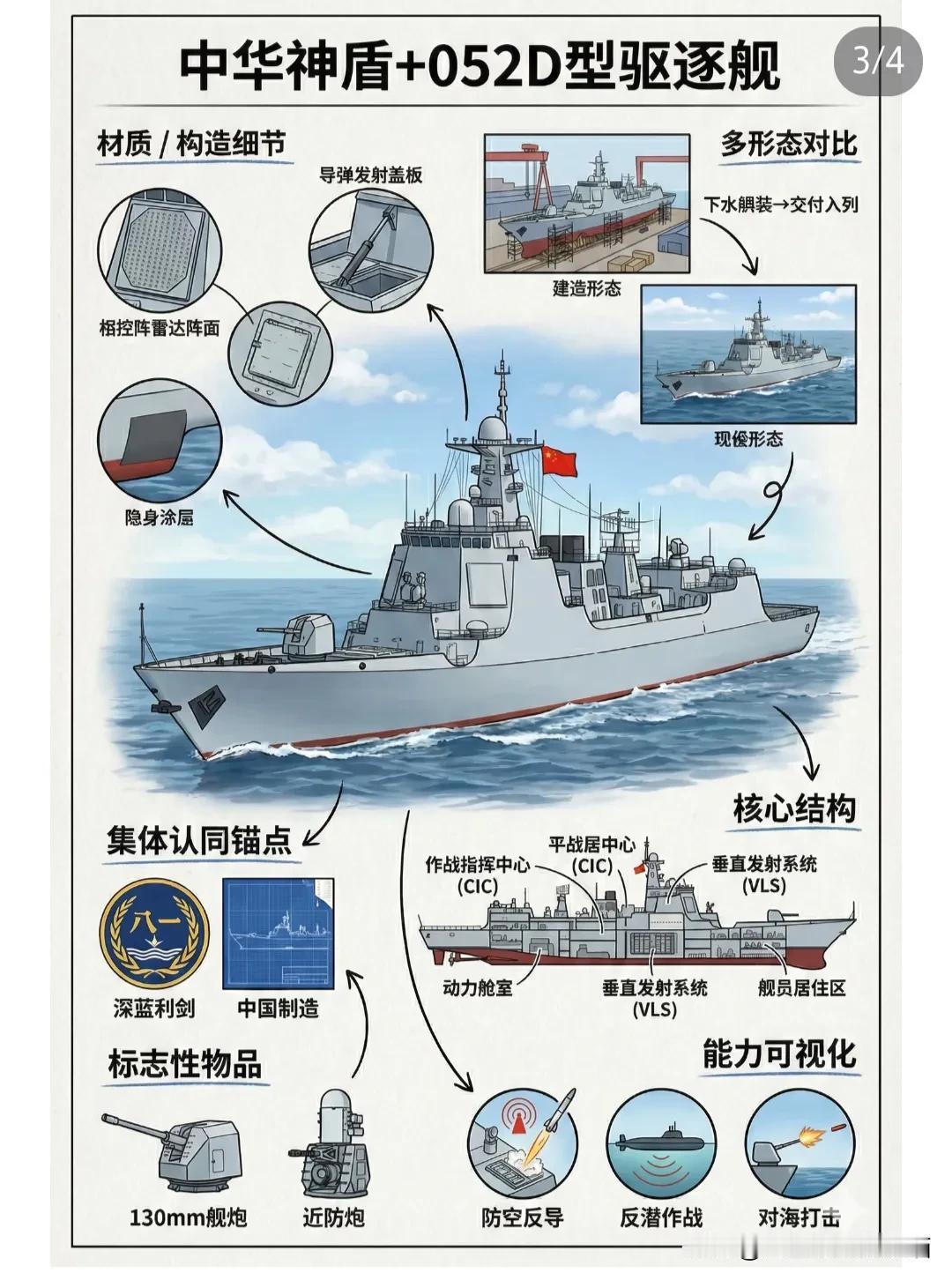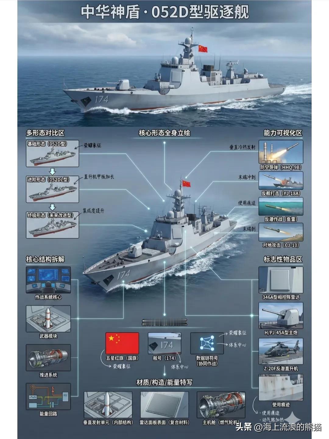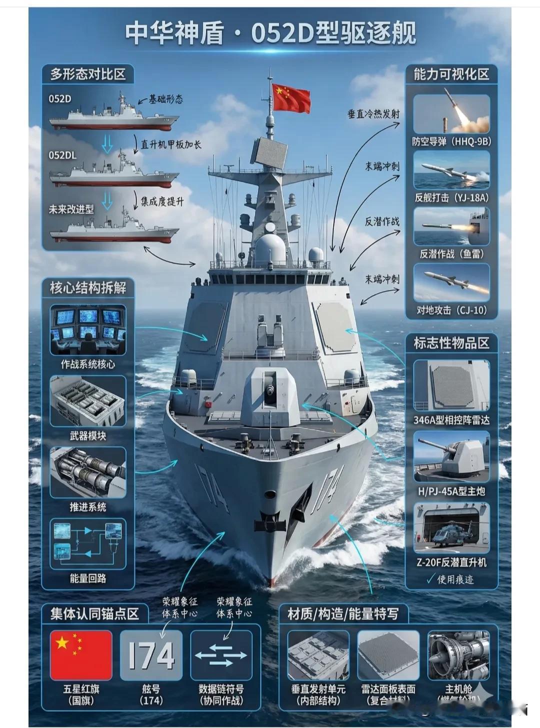 052D驱逐舰堪称海军利器。像湛江舰,舷号165,2021年入列,是052D改进型。它有宽大直升机甲板,方便远洋起降直升机。 其武器丰富到专治“火力不足恐惧症”。通用导弹垂发系统先进,载弹量大、无发射盲区,反应快,能全方位攻击拦截。舰艏有130毫米舰炮,口径大,可对海、对岸、防空。舰桥下方的11管30毫米舰炮,和舰空导弹构成三层防空网。 还有最新的驻马店舰,雷达升级为“四面大盾+两面小盾”,对隐身目标探测距离大幅提升,让隐身导弹无处遁形,实力不容小觑。