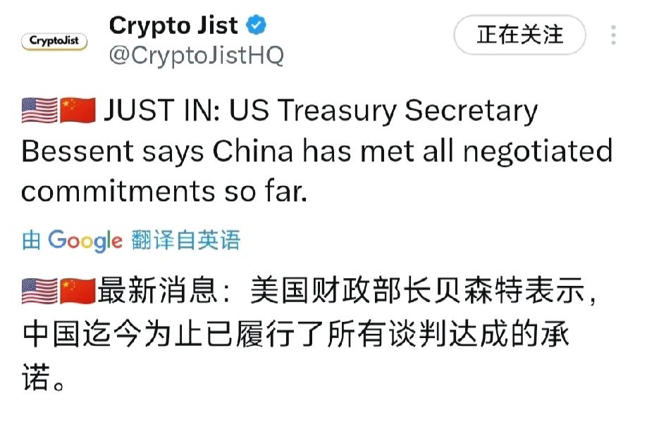 昨天,美财长贝森特对媒体说:“中国迄今为止已履行了所有谈判达成的承诺!”临走时他