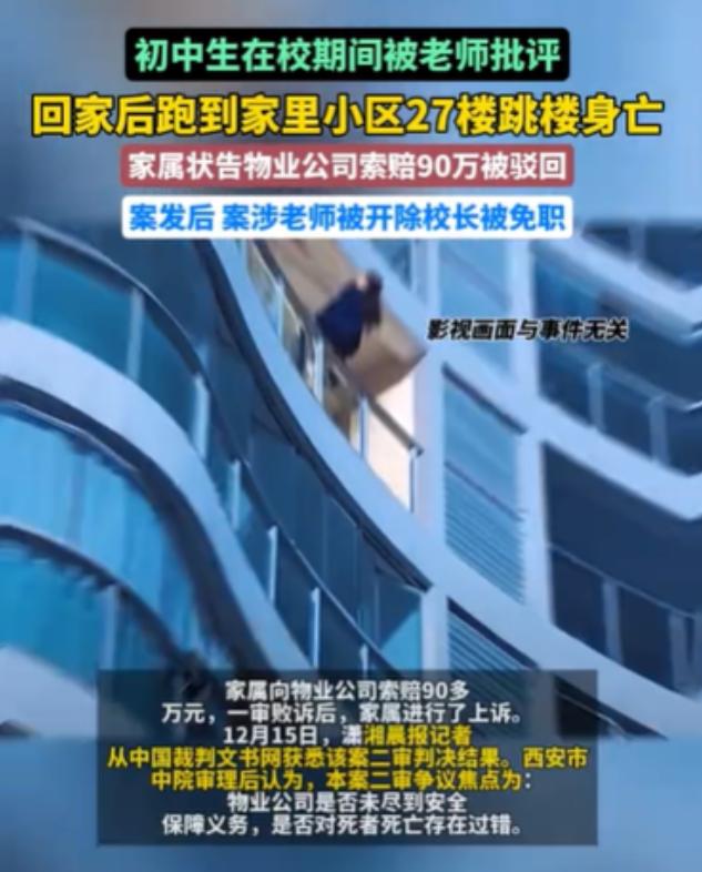 到底谁的错?陕西西安,一12岁初中生被老师批评,回家后直奔27楼楼顶,从窗台跳了下去,当场身亡,事发后,男孩父母将小区物业告上法庭,要求索赔90余万元,学校老师也受到处分。   近日,有记者从中国裁判文书网上面查到了一起民事纠纷案件的判决结果,整个过程引起了热议。   事情发生在2023年12月7日晚上,小军(化名)在学校看课外书被老师发现,老师当即对他进行了批评教育,可小军却觉得很没有面子,尊严受到极大打击。   回到小区后,小军没有回5楼的自己家,而是直接按了最顶层27楼的电梯按钮,来到楼上之后,小军踩着楼道里的4块砖爬上了窗台,打开窗户从上面跳了下去。   此时,小军的父母正到处寻找儿子的下落,往常小军都是6点左右就回到了家中,父母给学校老师打电话,对方也说孩子已经离开学校了。   父母把能找的地方都找了,就是没有任何线索,情急之下只好报了警。   警方随即调取了小区物业的监控,发现小军7点多的时候就进了单元楼,电梯监控显示他上了27楼,很快,警方就在单元楼后面的拐角处发现了小军的尸体,经过调查,排除了刑事案件的可能,小军系自杀。   看到这个结果,小军的父母悲痛欲绝,他们只希望警方尽快查出原因,他们实在无法理解,一个小孩为何就想不开自杀了。   警方走访调查发现了小军事发当天受到老师批评的事,有学生可以作证,当时小军的神情就出现了异样。   也就是说,小军的死和老师的批评有因果关系。   小军父母当即到了学校与老师及校领导理论,认为老师的过分言语对孩子造成了重大刺激,这才引发了孩子轻生。   学校不想事情闹大影响声誉,最终开除了该老师,校长也引咎辞职,学校还给了小军父母一部分经济补偿,小军父母这才息事宁人。   不过,回到家之后不久,小军父母又去找物业理论,在他们看来,如果不是物业没有及时清理楼道的废砖,孩子就不会爬到窗台上去,意外也就不会发生,物业应当承担责任。   物业对此也很无语,他们表示每天都会定期安排保洁进行清理,这砖是小区邻居放那里的,和物业无关,而且事发后,物业也一直配合警方接受调查,已经尽到了相应义务。   协商无果后,小军父母将物业告上了法庭,要求索赔各项损失90余万元,法院一审驳回了上诉。   小军父母不服,再次提起了上诉,法院二审认为小军的死系其主观选择,他已年满12周岁应当意识到自己行为的后果,因此和那几块砖没有必然的因果联系,物业不应承担责任,于是,二审再次驳回了上诉。   这起案件曝光之后也立刻引发了热议,不少网友更关注的点在于,学校为何要开除老师,从现有监控画面来看,老师并没有殴打小军,只是进行批评教育,难道这也不可以了吗?   不少学生家长担心,学校如此作为,很可能寒了想好好教书育人的老师的心,如果所有老师都对学生不管不问,只是完成本职工作,那学生的成长又该如何保障?
