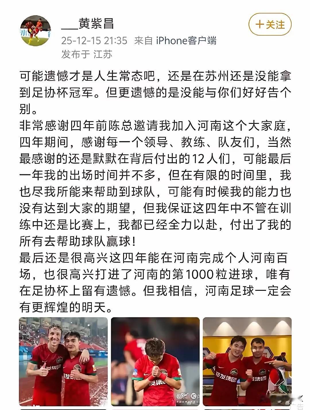 黄紫昌告别,欲上高原会师一众老队友,云南玉昆郭光琪薅老东家羊毛不客气。 河南球迷喜爱的小黄人黄紫昌发文告别球队,有可能加盟云南玉昆,汇合一众昔日队友,赵宇豪表示会照顾好这位老熟人。 原河南建业总经理兼主教练郭光琪担任云南玉昆体育总监后,从河南建业陆续招进赵宇豪,小迪力,李松益,还有技术总监欧楚良和二十年老队医孙国立,建业元素不断增加。希望云南玉昆新赛季更进一步,河南球迷在没有河南队比赛的时候可以支持一下。 河南队拉莫斯获最佳主教练, 王上源入围金球奖, 卡多索回归俄超母队。 网传阿奇姆彭签约0.5十0.5的合同本人未签字,那12月合同到期大概率离队,不知会否在中甲继续生涯。 左后卫刘斌大概率加盟重庆铜梁龙。卢永涛回归泰山,续约到2027年。 郑达伦合约到期后已确定离队。 纳萨里奥和家人仍在郑州享受假期,逛街,火锅,购物,休闲,健身。