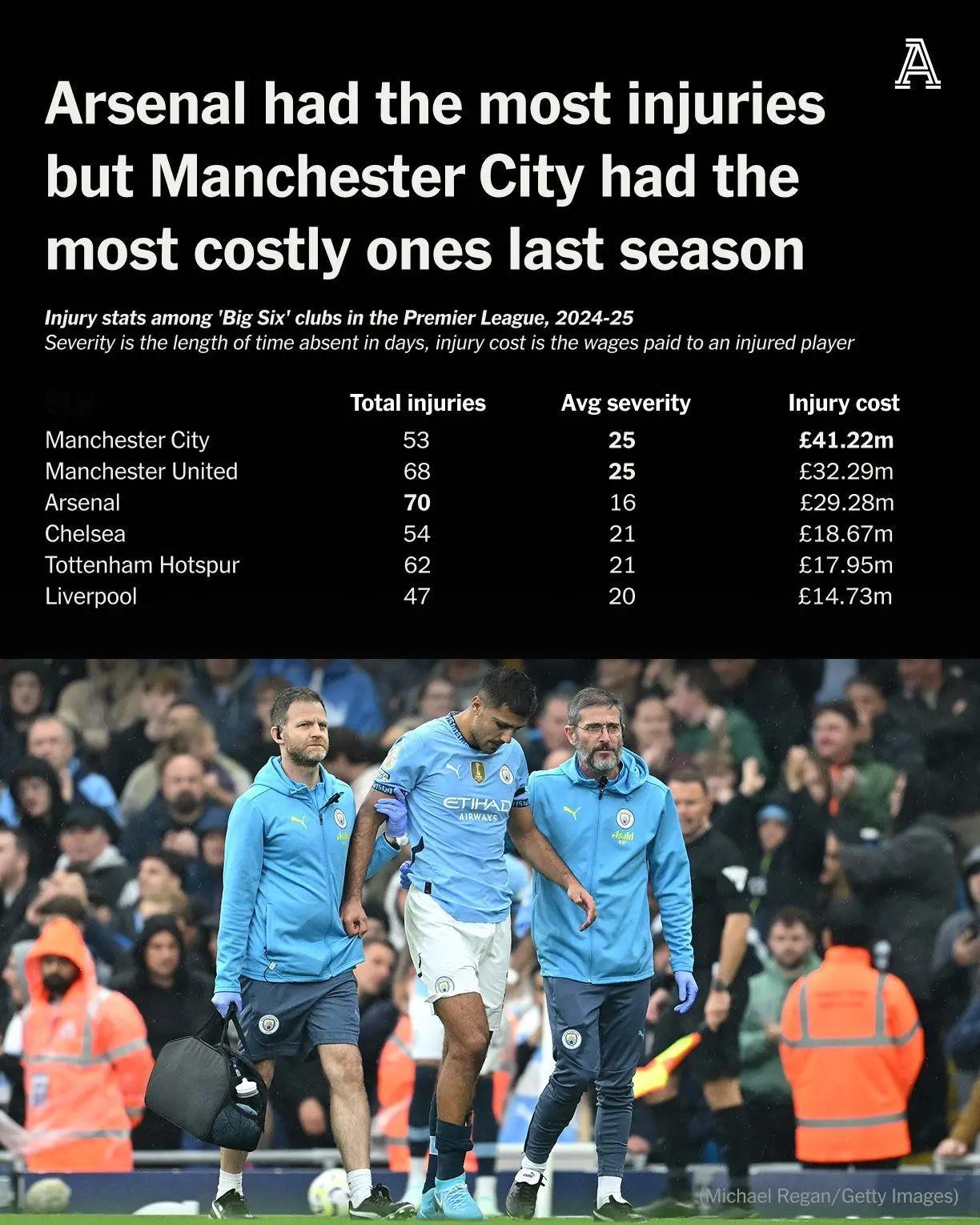 过去五年,英超俱乐部的伤病问题已导致薪资损失超过10亿英镑。数据分别是:- 曼城:53人次,25天,4122万英镑- 曼联:68人次,25天,3229万英镑- 阿森纳:70人次,16天,2928万英镑- 切尔西:54人次,21天,1867万英镑- 热刺:62人次,21天,1795万英镑- 利物浦:47人次,20天,1473万英镑■ 阿森纳伤病最多,但曼城上赛季的伤病成本最高■ 英超伤病成本高于其他欧洲主要联赛■ 过去五年中,Big 6豪门里伤病最多的球队均未赢得联赛冠军