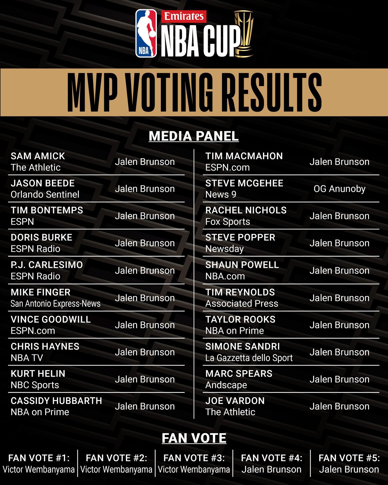 杯赛MVP唱票,媒体20票布朗森19票,OG拿1票。有意思的是下面的球迷投票马刺vs尼克斯NBA杯决赛