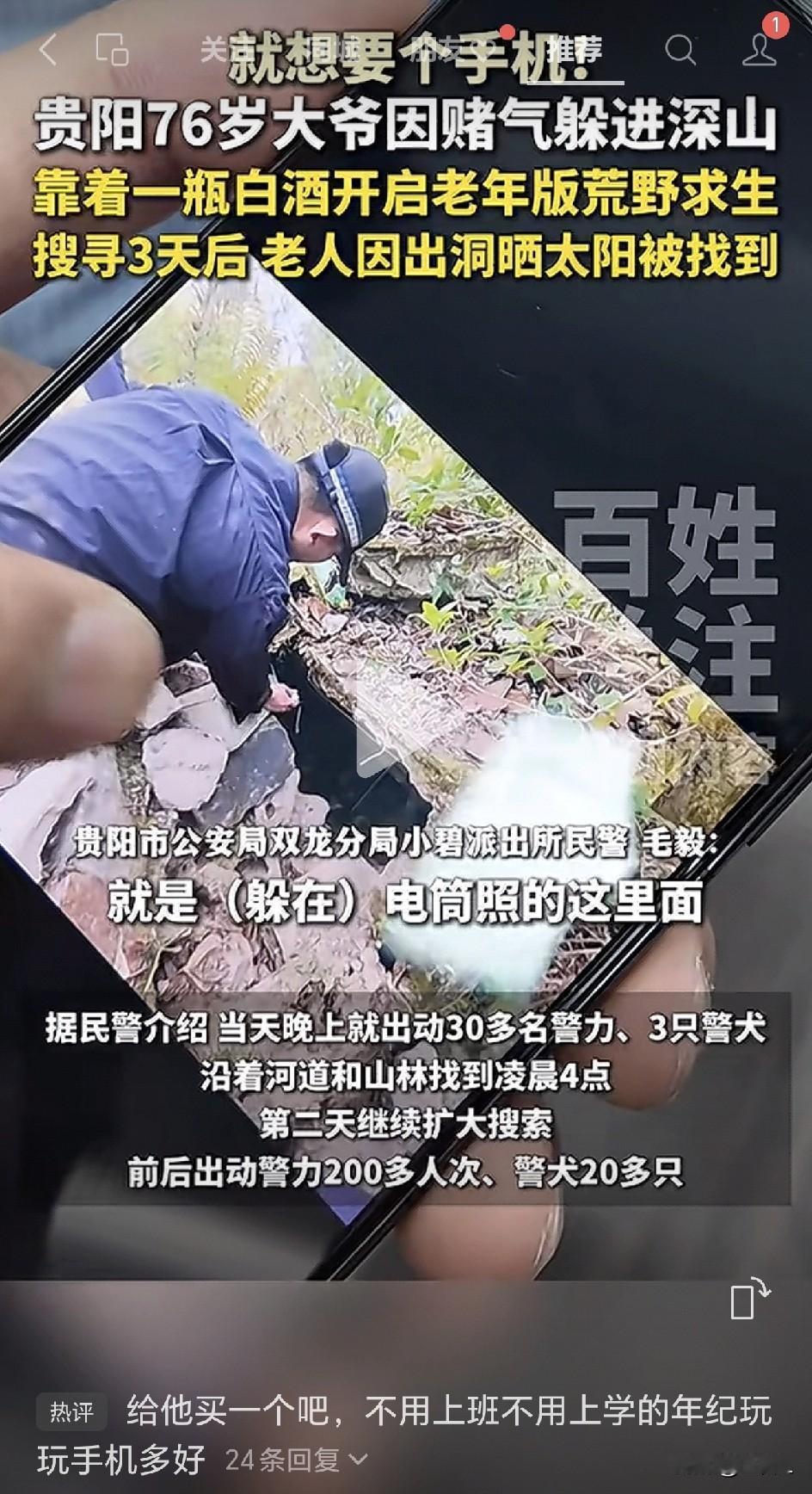 贵阳76岁“倔老头”离家出走,躲进竹林3天,全城出动200警力搜救,原因居然只是因为“它”?!结局让人哭笑不得! 一瓶白酒一片竹林,老人上演现实版“荒野求生”,被找到时正悠闲晒太阳,身边摆着个空酒瓶——这是他“野外生存”三天的全部装备。 12月9日下午,贵阳某小区监控拍到这样一幕:一位白发大爷慢悠悠走进超市,出来时手里多了一瓶白酒。然后他沿着河边步道越走越远,最后消失在镜头里。 傍晚,家人发现老人没回家吃饭,到处找不到,慌了神赶紧报警。 “76岁的老人,只带了一瓶白酒,这大冷天的……”接警民警心里咯噔一下。当晚气温预报最低3度,这对老人来说太危险了。 当晚,30多名警力带着3只警犬就进山了。手电光在漆黑的山林里晃动,“刘大爷!刘大爷!”的呼喊声此起彼伏。搜到凌晨4点,一无所获。 第二天,搜救规模升级。警方前后出动200多人次、20多只警犬,把附近山头翻了个遍。无人机也出动了,热成像仪扫描着每一个角落。 但,其实在11号晚上,搜救队离真相只有一步之遥。 一队民警搜到了那片竹林里的一个地洞时,用手电筒往里照:“刘大爷!您在里边吗?” 地洞深处,刘大爷正屏住呼吸。“我才不答应呢,让他们急急。”老人后来笑着说。 大爷在地洞里实在藏的太深,民警们没发现异常,转身去了别处。 这场“捉迷藏”游戏,大爷赢了第一回合。 直到12号中午,另一队民警搜寻到此处,正碰到大爷盘腿坐着晒太阳呢,精神头还不错。 “您这几天吃啥了?”民警问。 “没吃。”大爷答得干脆。 而真相让人哭笑不得:大爷的离家出走就只是为了一部智能手机。 找到人后,民警没有急着批评,而是玩起了“套路”。 “我们不回家,不回家。”民警顺着大爷的话说,“您不是想要手机吗?走,咱们现在就去买!” 一听买手机,大爷眼睛亮了,高高兴兴跟着民警下了山。到医院一检查,除了有点累,身体啥事没有。 原来,刘大爷和孙子住一起。他看到邻居老人用手机刷视频、看新闻,心里痒痒,也让孙子给买一部。 “之前买过,他不会用,放那儿落灰了。”孙子觉得浪费钱,这次没答应。 就为这事,爷孙俩闹别扭了。大爷越想越委屈:“年轻人整天抱着手机,我就不能有个?” 9号下午,他赌气买了瓶白酒,来了场说走就走的“旅行”。 更绝的是,大爷这三天两夜的“野外生存”还挺有策略:白天晒太阳保暖,晚上喝口白酒御寒。平时在农村种地练出的好身板,这时候派上了用场。 事后民警跟家属好好聊了聊:“老人就像孩子,得哄着来。他真缺那部手机吗?不一定。他缺的是被重视的感觉。” 孙子也认识到问题,答应耐心教爷爷用手机。听说真要学用智能手机了,刘大爷笑得像个孩子。 这场“乌龙失踪案”虽然结局圆满,但笑着笑着,就让人笑出了泪花。 我们身边有多少这样的老人?他们不会用智能手机,不懂扫码支付,看着日新月异的世界,既好奇又无措。 他们闹脾气、耍性子,有时候不是真的想要什么,而是在喊:“看看我!陪陪我!别把我落下了!” 刘大爷是幸运的,有全力寻找他的家人,有尽职尽责的民警。但这个故事应该给我们都提个醒: 关爱老人,不仅要管温饱,还要懂他们的“心饱”。 多一点耐心,教他们用用新科技;多一点时间,听他们唠唠心里话;多一点理解,包容他们的“孩子气”。 毕竟,谁没有老去的一天呢?今天我们怎么对待老人,明天后人就可能怎么对待我们。 如今,刘大爷已经安全回家。那部引发风波的手机,家人说周末就带他去买。而那片竹林,大概会成为大爷记忆里一次特别的“冒险”——虽然方式有点任性,但至少,他的话终于被认真倾听了。 老人要的从来不多,也许只是一部能看看世界的手机,也许只是你愿意为他停下脚步的耐心。 别忘了,那个曾经教你走路的人,现在可能需要你牵着他的手,走进这个他有点跟不上的新时代。 信息来源于百姓关注,侵联删!