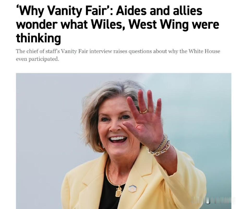 白宫内部对幕僚长苏西·威尔斯的采访赶到震惊。采访内容: 一位白宫官员疑惑地问道:“为什么是《名利场》这家媒体?.... 他们从来就没对我们好过。”他补充说,这“非常非常奇怪”。 一位接近白宫的人士表示,这次采访“极其令人沮丧”。 另一位与白宫关系密切的人士表示,他们认识威尔斯几十年了,对她参与此事感到“非常惊讶”。 第三个人表示,共和党人对白宫在需要大力宣传其经济成就之际却显得缺乏纪律感到非常沮丧。“我们到底在说什么?杰弗里·爱泼斯坦和委内瑞拉?詹姆斯·科米?莱蒂西亚·詹姆斯?人们对此感到沮丧,我认为其中很大一部分是对白宫的沮丧,但很大一部分是对总统的沮丧,”该人士说道。 一位熟悉白宫思路的共和党高层人士表示:“苏西非常精明,她很清楚‘背景调查’和‘非正式谈话’的含义;这显然是她有意为之,”知情人士说。“她显然觉得自己完全有权如此畅所欲言,而且总统无论如何都会支持她。”