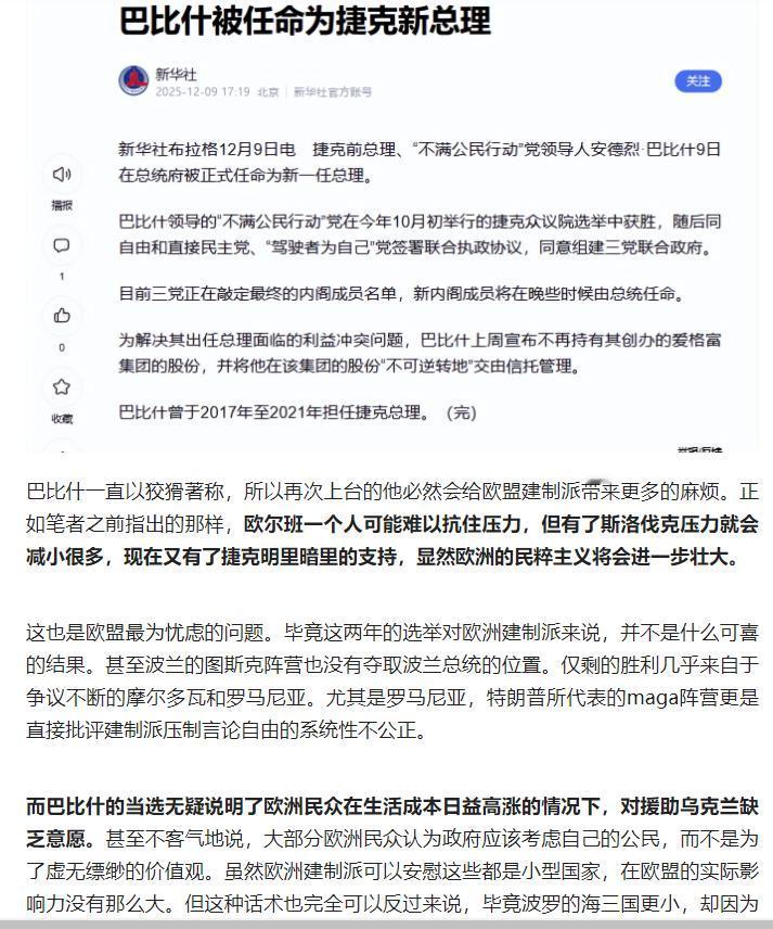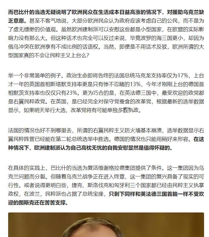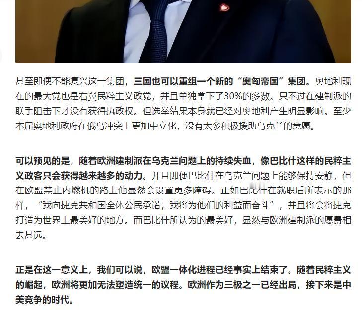 欧洲建制派因乌克兰问题急于访华却诚意不足,而捷克巴比什等右翼民粹政客接连上台,英法德等国建制派支持率低迷、民粹政党崛起,欧盟一体化进程实质终结,欧洲已难成三极之一,进入中美竞争时代。 原文来自头条创作者新潮沉思录的文章: