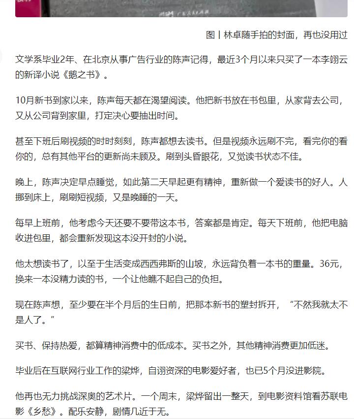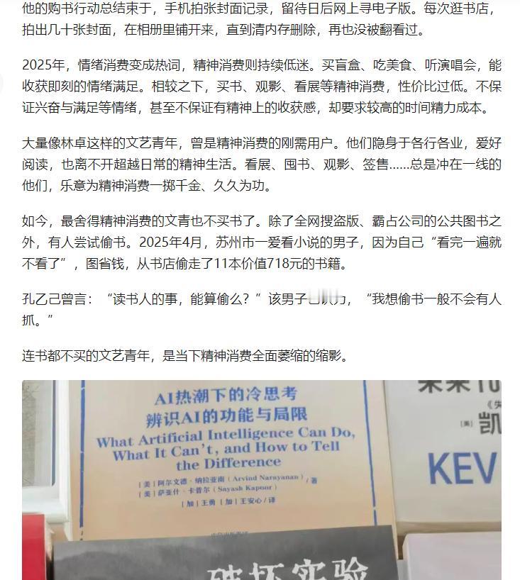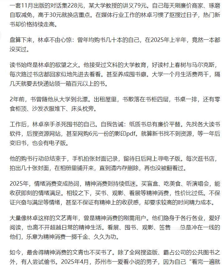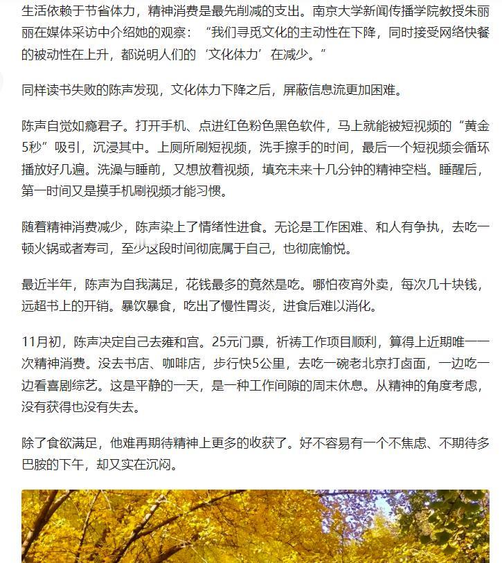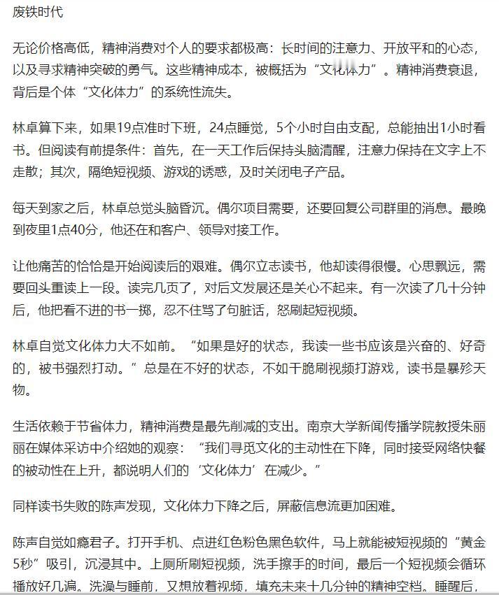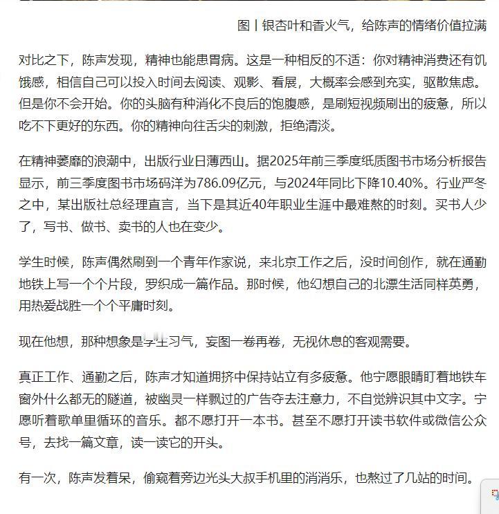 2025 年文艺青年精神消费退潮,不愿买书、观影、看展,背后是 “文化体力” 系统性流失 —— 难以投入长时间注意力、易被短视频诱惑,虽有人尝试复健精神生活,但出版行业低迷,精神萧条成显著趋势。 原文来自头条创作者真故研究室的文章: