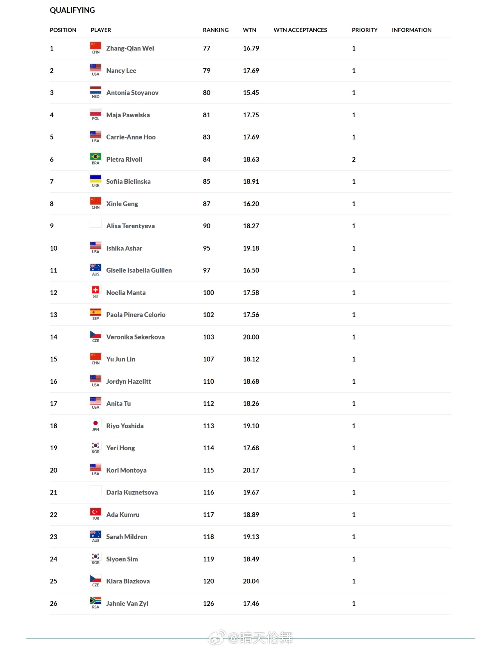 澳网2026 青少年名单女单正赛:张瑞恩🇨🇳、孙心然🇨🇳、邵羽杉🇨🇳、渠依含🇨🇳入围,魏彰倩🇨🇳暂列替补第一位女单资格赛:魏彰倩🇨🇳、耿心乐🇨🇳、林禹君🇨🇳