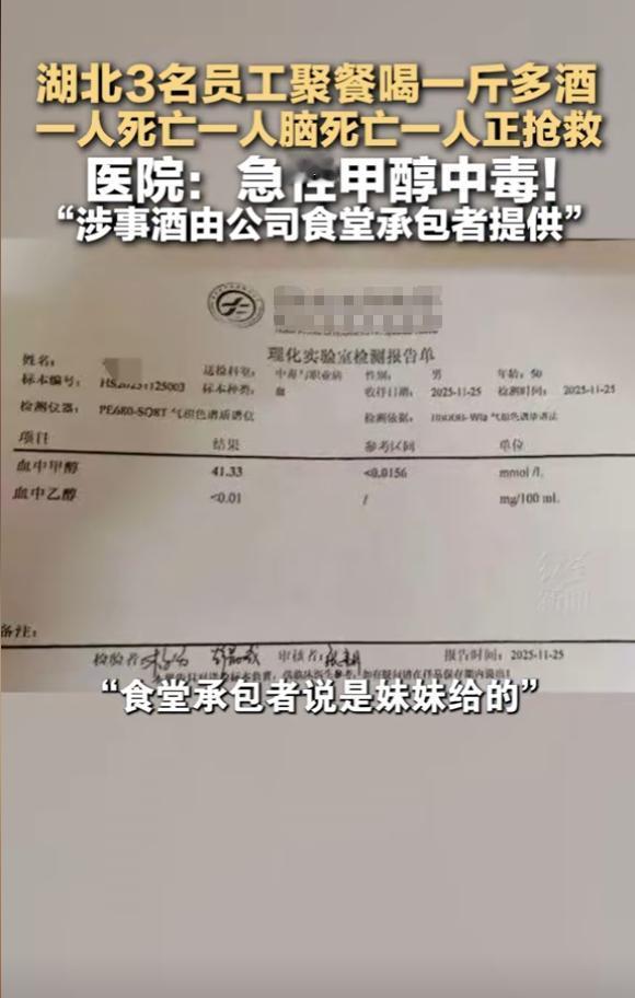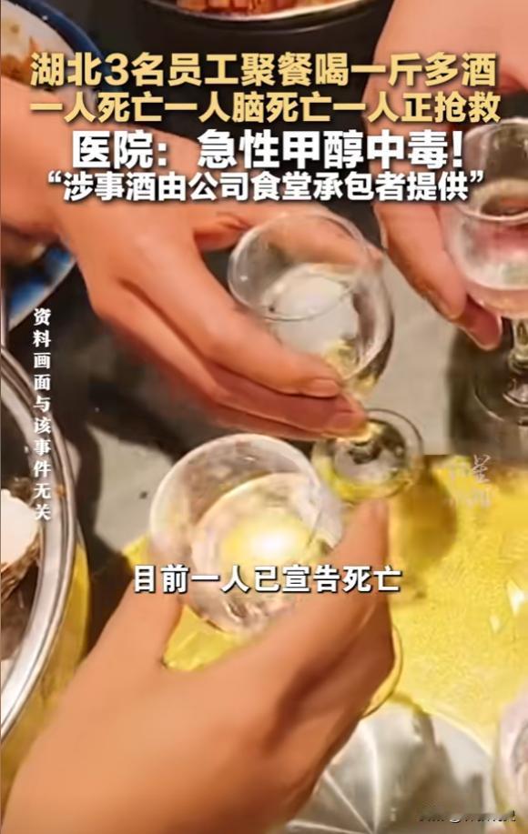 “悲剧还是发生了!”湖北十堰,一男子去食堂取酒,打算和同事聚餐小酌,没想到食堂员工误将工业酒精装进去,男子和2名同事喝完后,突然呼吸困难,头痛欲裂,随后倒地昏迷不醒,情况十分危急。[尬笑] 湖北郧西县发生一起误饮工业酒精中毒事件,导致一人死亡、一人脑死亡、一人昏迷的严重后果,事件的起因是单位食堂员工误将工业酒精装入盛装白酒的瓶子,被不知情的同事带去聚餐饮用。 工业酒精与食用酒精外观相似,却有着本质区别,工业酒精一般用于工业生产和清洁,其中常含有超标的甲醇等有毒成分,而食用酒精以粮食等为原料,经过专门工艺处理,可供食品行业使用。 一旦误饮含甲醇的工业酒精,甲醇在人体内会代谢为甲醛和甲酸,严重损害视神经和中枢神经系统,短时间内就可能造成失明、器官衰竭甚至死亡。 在这起事件中,饮用者最初可能感到头痛、乏力或视物模糊,这些都是甲醇中毒的早期信号。遗憾的是,症状未能引起足够警惕,最终导致不可挽回的后果,后经检测,中毒者血液中甲醇浓度极高,证实了中毒原因。 这起悲剧暴露出有毒物品日常管理的重大漏洞,工业酒精等化学物品必须与食品、饮品严格分开储存,容器上应有醒目、牢固的“严禁饮用”标识,切勿使用饮料瓶、酒瓶等日常容器分装,从源头上杜绝误拿误用的可能。 若不慎误饮或怀疑甲醇中毒,必须立即就医,急救的关键在于尽快阻止甲醇代谢,临床常采用乙醇拮抗疗法,严重者需进行血液透析净化毒素,每一分钟都至关重要,及时送医是挽救生命的最重要一步。 日常工作中,许多单位都会用到类似物品,却未必重视其存放安全,一次疏忽就可能酿成终身遗憾。除了严格管理,对接触这些物品的人员进行定期安全培训也必不可少。 安全无小事,警钟需长鸣,从这起事件中我们更应认识到,规范管理不只是规章条文,更是对生命的切实负责,你所在的环境里,是否也存在类似的安全隐患?对于预防这类意外,你有什么实际的建议?欢迎分享你的观察与思考。 看到湖北这起工业酒精中毒的新闻,真是又痛心又气愤!消息出来之后,网友们都炸锅了,评论区的讨论特别热烈,我梳理了几个主要的关注点。 工业酒精和食用酒精的存放区域按理说应该严格分开,这种“误拿”背后是安全管理的巨大漏洞。 “食堂里怎么能出现工业酒精,还随便用饮料瓶装,这不是等着出事吗?” “味道能一样吗,喝的时候没尝出来?” 工业酒精的气味和口感与普通白酒差异明显,为什么会喝下去而没有立刻察觉?可能他们平时喝的就是便宜的散装酒,本身味道就比较冲,所以即使觉得不对劲也没往心里去。 希望不仅直接责任人要受到法律严惩,食堂的承包方以及员工所在公司也应被严厉追责,并承担巨额赔偿。 只有让责任方付出沉重代价,才能狠狠震慑那些对安全生产漠不关心的单位和个人。 “饮料瓶分装害死人,我家也有这习惯!” 这起悲剧也让很多人反思自家习惯,用喝过的饮料瓶、矿泉水瓶来装洗洁精、机油、酒精等非饮用液体,是很多家庭常见的做法。 “看完新闻赶紧回家把那些瓶瓶罐罐清理了,太吓人了!” 如果一定要用,必须立即贴上醒目的警告标签,并与其他食品饮料分开放置,从源头上杜绝误拿误饮的可能。 如果企业能严格管理,如果食堂工作人员能有最基本的安全意识,如果大家都能对来源不明的散装酒多一分警惕,悲剧也许就不会发生。 对于避免这类悲剧,你有哪些好建议?欢迎在评论区分享你的看法和经历,让更多人的安全意识能因此提高一点。 信息来源:红星新闻