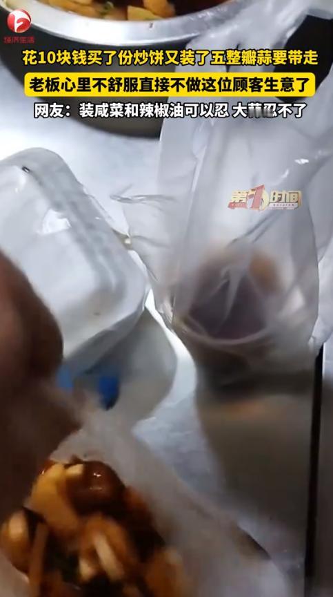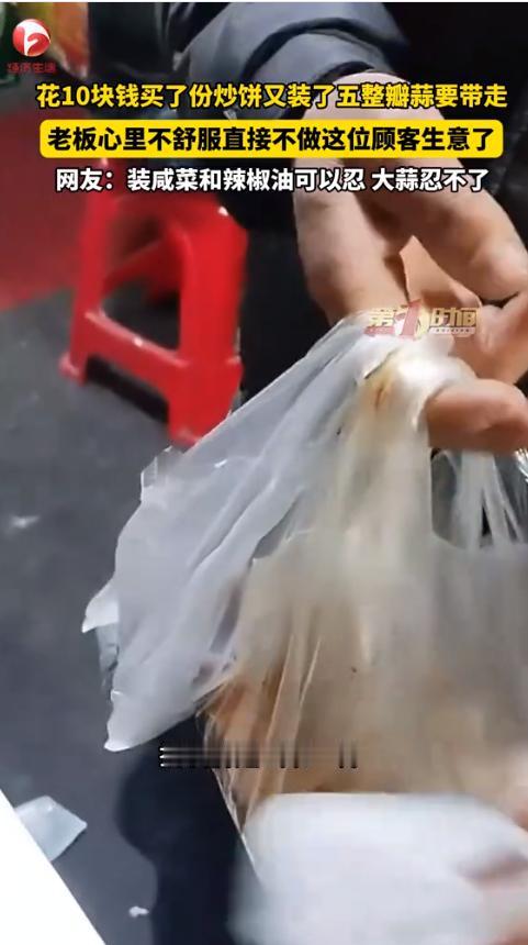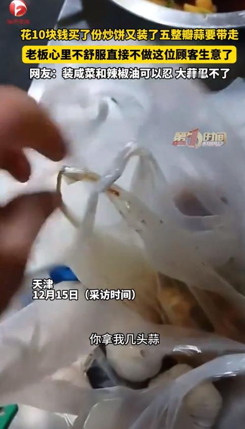 天津一男子去店里买10块钱的炒饼,等待出餐期间打包了一盒辣椒,一兜咸菜,顺手拿了5头完整的大蒜。老板出餐后一看顿时大怒:“我不卖了,你走吧!” 占小便宜的见过,占小便宜还“连吃带拿”的还真是头一次见。尤其是在2025年的今天,把去饭馆吃饭当成“进货”的,那可真是十分少见。 近日,天津一名男子空着手来到了当地一家饭店说要点饭,挑了半天点了份10块钱的炒饼,说要打包带回家吃。 店里面只有老板一个人,就回厨屋给他做饭去了。 等到老板出来时,发现男子手里面多了三个塑料袋。 食客买饭带回家吃,顺便带点咸菜什么的回家也是常有的事,但是一拿拿三个塑料袋的,老板还是第一次见。 于是,他让那男子把那三个塑料袋放下。 10块钱的东西至于拿3个塑料袋的调料吗? 老板打开第一个袋子,往里一看,顿时血压飙升。 一二三四五,整整五头完整的大蒜! 这大蒜老板是4.5一斤批发的,这5头大蒜得8两重。 也就是说,光他拿的大蒜就接近三块六。 老板接着打开第二个袋子,一兜的咸菜。再打开第三个袋子,一小瓶辣椒油。 10块钱的饭,他光占得便宜就就快5块钱了。 老板自然不愿意了,直接对男子说:“你你走吧你,我不卖你了!” 虽然饭店主动往外赶客说出去不太好听,但这件事追根究底确实是食客不对。 一份十块钱的炒饼利润本来就没有多高,你拿点调料属于是配套服务,店主也不会说什么。可你直接拿人家5头大蒜,这远远超过了一顿炒饼的正常需求。 这不像是自己吃,更像是打包带走用作家庭储备。 也许这位食客觉得,反正是放在外面的,是免费的, 拿多拿少都是个人的自由,但这很明显是忽视了大家默认的社会契约——免费提供给你调料,但你得适量。 这种行为的确不能算是盗窃,但已经违背了诚信和公德。如果每个食客都拿5头大蒜,那以后一份炒饼可能就涨到14块钱、15块钱。 吃亏的还是消费者自己。