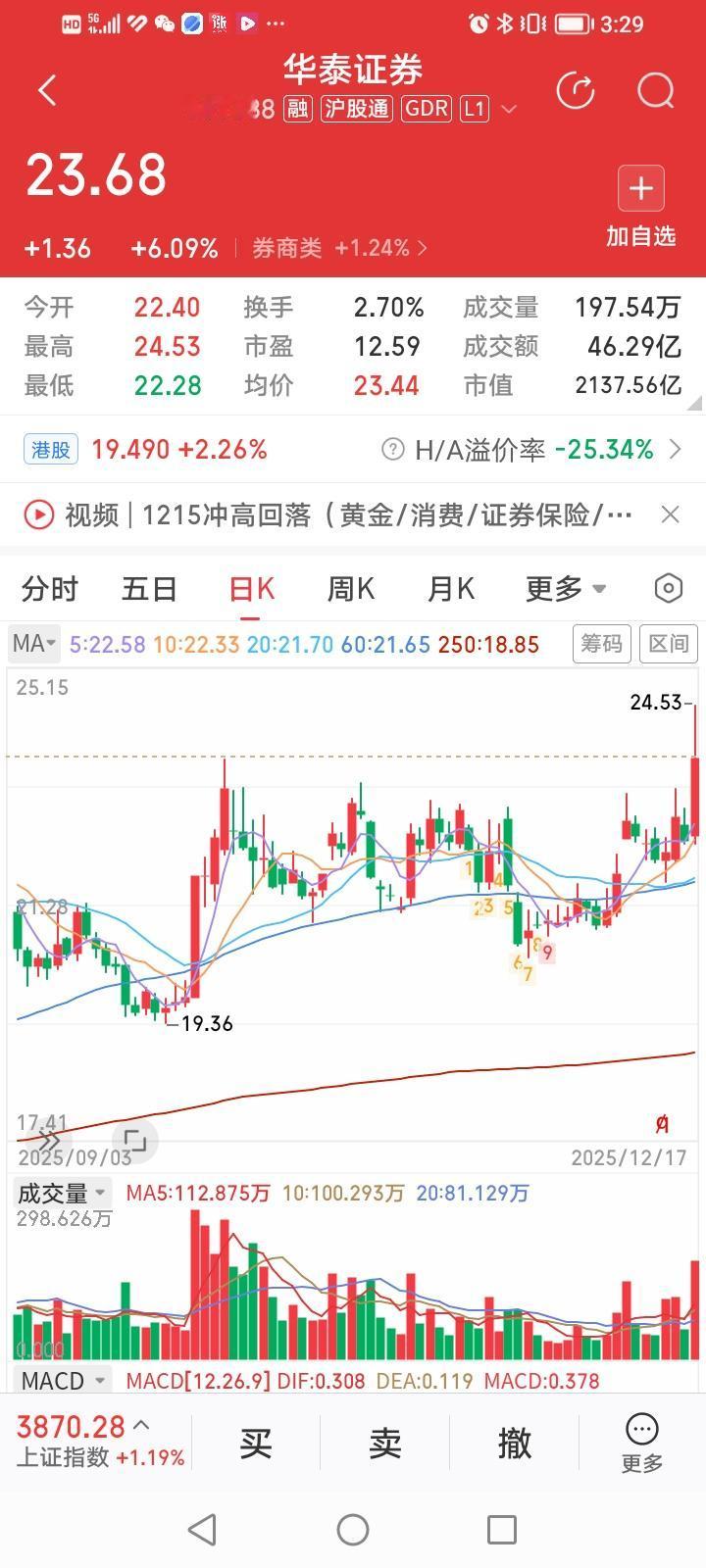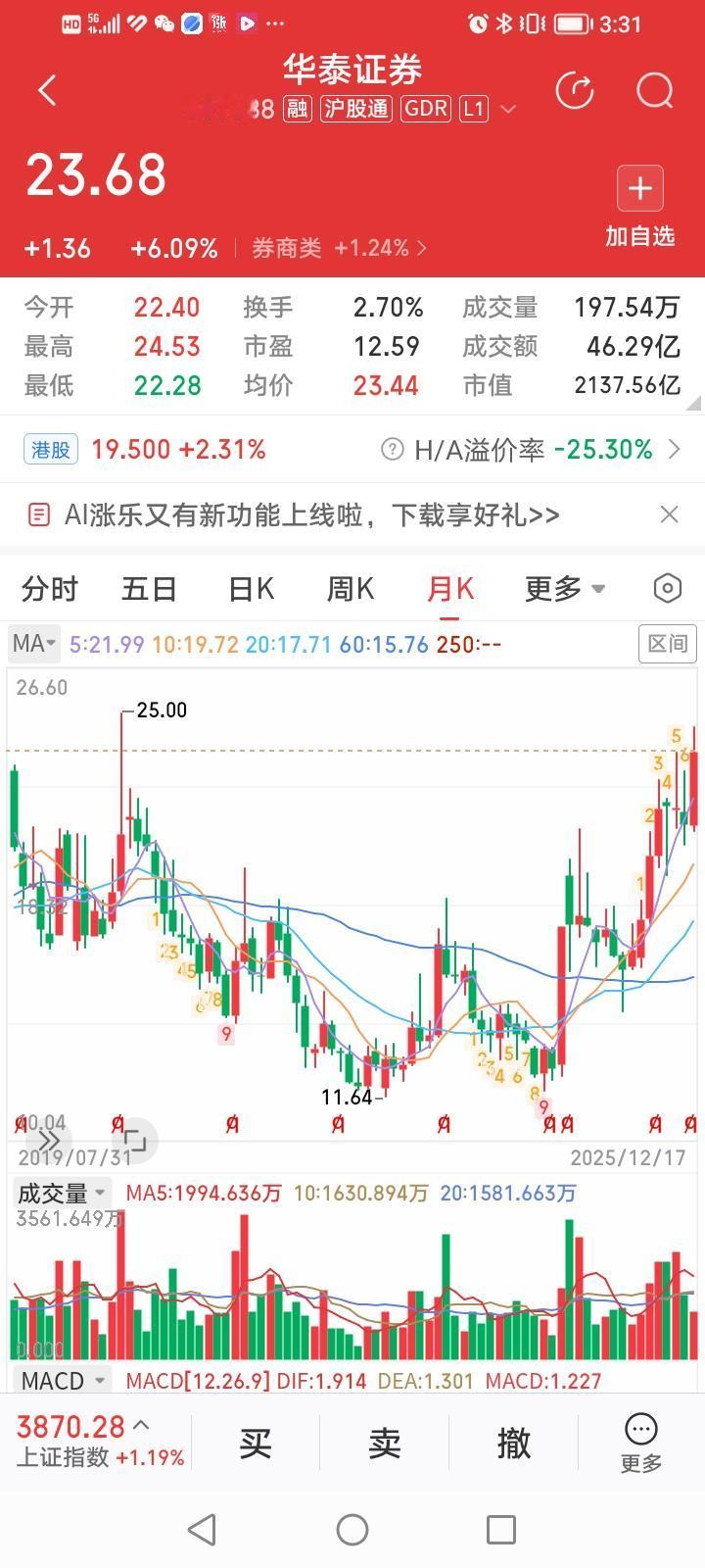 什么情况?今天华泰证券也太牛了吧!收盘大涨6.09%,涨幅居券商股涨幅排行榜第一名,盘中甚至一度冲击涨停,而且今天的最高价和收盘价双双创出今年新高。华泰证券也因此一举晋身为券商龙头和牛市旗手。 华泰证券目前动态市盈率12.59倍,其抢先上线的AI涨乐APP不知是否好用?但创新精神可佳。 华泰证券股价似乎已经成功向上突破了,今天盘中最高价24.53元,离2020年的最高价25元仅一步之遥,看来华泰证券股价创出五年新高指日可待了。 没想到华泰证券的年末收官之战很有可能变成主升浪啊。