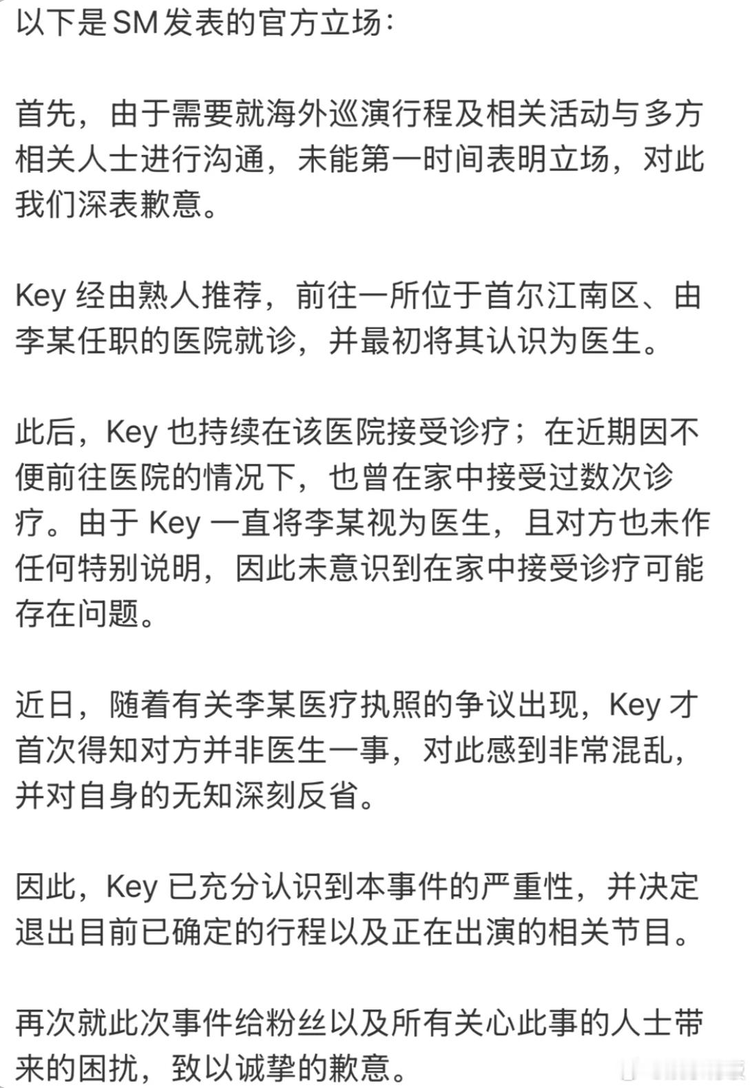 金起范就非法注射风波道歉金起范发文道歉 近日,SHINee 成员 KEY(金起范)就卷入 “非法注射” 风波一事,通过个人社交平台发布手写信致歉,回应公众关切。致歉文中,金起范首先就相关争议引发的担忧,向粉丝及大众表达诚挚歉意。他坦言,对于近期才得知的相关事实感到混乱无措,对未能及时整理立场、说明后续计划深表愧疚。金起范提到,自己原本以为能够远离此类事件,却因疏忽未能理性看待问题,辜负了支持者的信任,内心满是愧疚与羞愧。同时,他承诺将尽己所能认真处理此次事件,并重新审视自我与周遭环境。