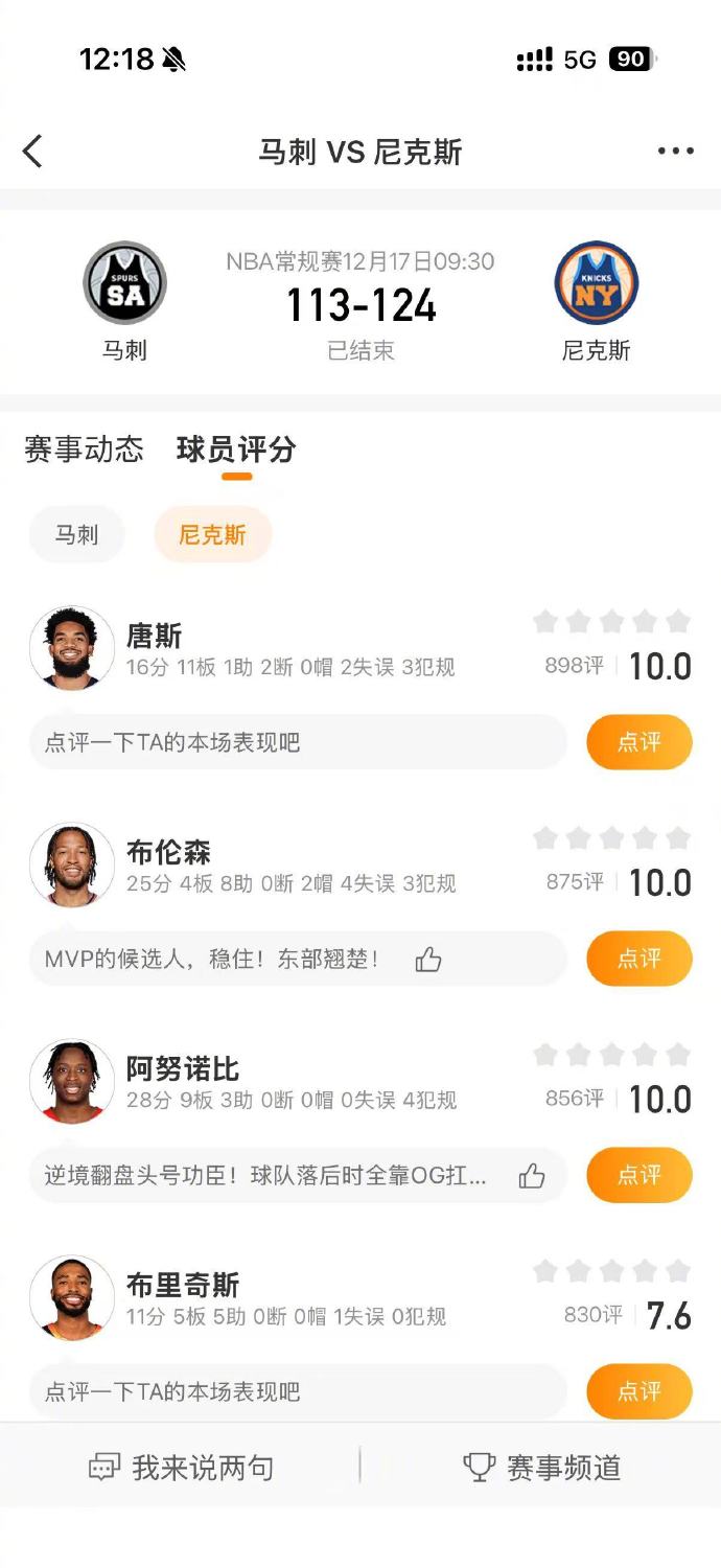 尼克斯124-113战胜马刺,夺得NBA杯冠军!阿奴诺比28分9篮板3助攻,布伦