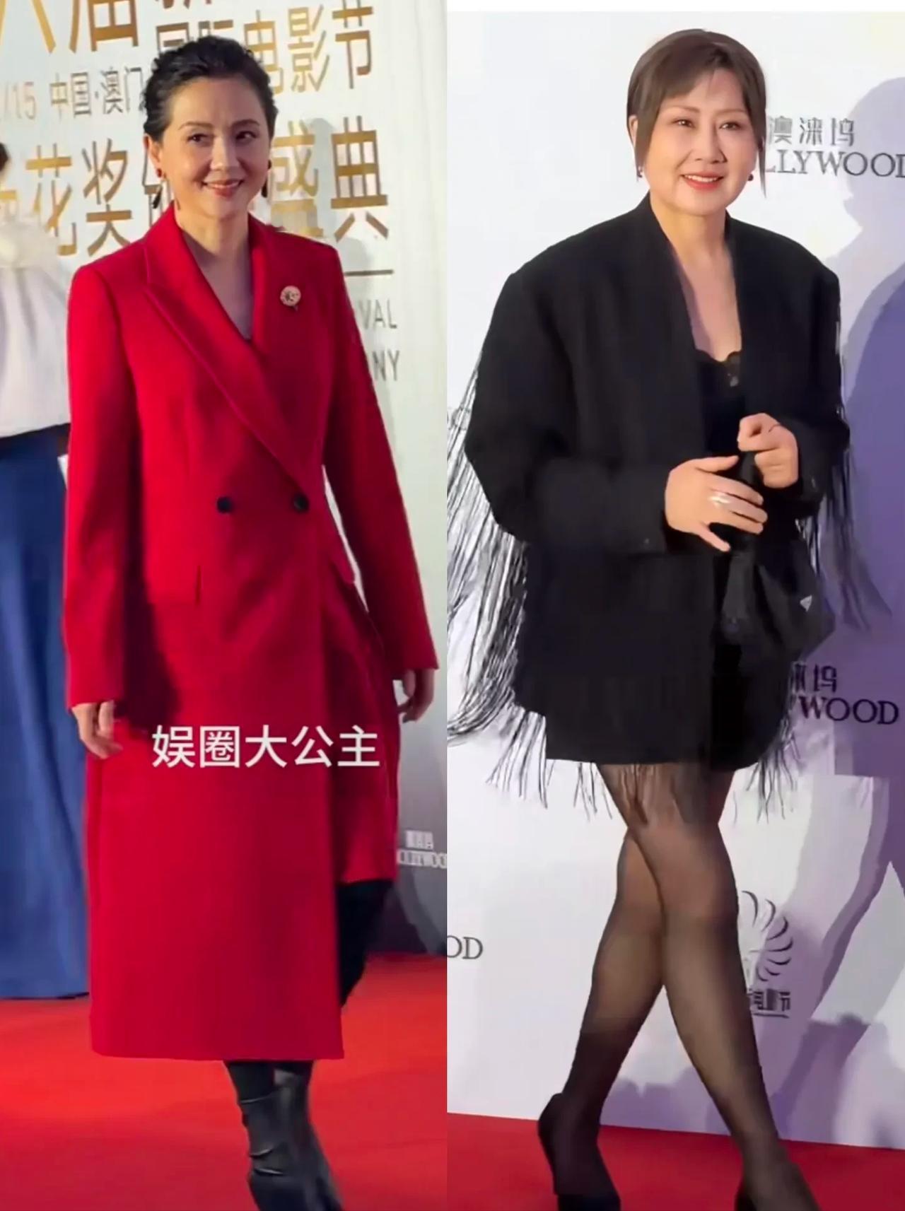 知名演员张凯丽,真的太尴尬了!果然什么样的年龄穿什么样的衣服,才是最聪明的选择~ 12月15日,盛装亮相澳门电影红毯活动的张凯丽,估计做梦都没想到,大胆尝试短裙黑丝新造型,不仅又被吐槽了,竟还被穿着低调得体的陶慧敏给秒了!本想着会收获到满屏夸赞,没成想,却迎来了大批网友的差评,不少人问:60+的人了,为何老喜欢穿些露大腿的短裤短裙,即不合适也不体面,还显得有点low...也不知她本人看到后作何感想? 现场照中,63岁的张凯丽一袭黑色流苏廓形外套,下搭短裙黑丝示人,特意秀出修长美腿,魅惑中不失小性感,马尾微卷,好有女团范儿!可没想到,却被网友纷纷吐槽不得体,年龄大了,优雅端庄才是首选!真心没有一身大红色修身呢子外套配黑色长靴,妆容清雅的陶慧敏来的舒服养眼。看来女明星上了年纪,穿衣造型还是要稳重大气一点,才能更显气质和品味啊!