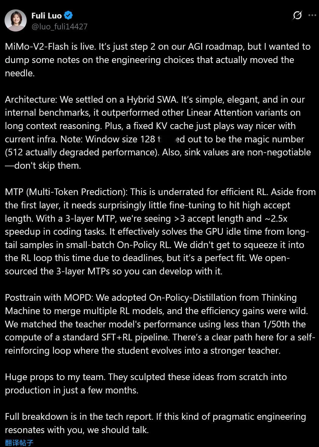 罗福莉对MiMo-V2-Flash的介绍:MiMo-V2-Flash 已正式上线。这只是我们 AGI 路线图中的第二步,但我想把一些真正产生决定性效果的工程选择随手记下来。架构:我们最终采用了 Hybrid SWA。它足够简单、足够优雅,而且在内部基准测试中,在长上下文推理上明显优于其他线性注意力(Linear Attention)变体。另外,固定 KV cache 与现有基础设施的兼容性要友好得多。备注:窗口大小 128 是那个“甜点值”(512 反而会拉低性能);sink values 是不可妥协的,千万别省略。MTP(Multi-Token Prediction):这一点在高效 RL 中被严重低估了。除了第一层以外,MTP 实际上只需要极少的微调,就能达到很高的 accept length。使用 3 层 MTP 时,我们在编程任务中看到了 accept length 大于 3,以及约 2.5 倍的速度提升。它基本上解决了小 batch 的 On-Policy RL 中,由长尾样本造成的 GPU 空转问题。这次由于时间节点原因,我们没能把它塞进 RL loop 里,但它在这里几乎是天作之合。我们已经开源了 3-layer MTP,方便大家直接基于它进行开发。使用 MOPD 的后训练:我们采用了 Thinking Machine 提出的 On-Policy Distillation,用来融合多个 RL 模型,效率提升非常夸张。在不到传统 SFT + RL pipeline 的 1/50 计算量下,我们就达到了 teacher 模型的性能。这里已经能清晰看到一条路径:学生模型不断进化,最终反过来成为更强的教师模型,形成自我强化的闭环。致谢:向我的团队致以最高敬意。他们在短短几个月内,把这些想法从零打磨到可上线的生产系统。小米发布最新MiMo大模型小米新模型什么水平