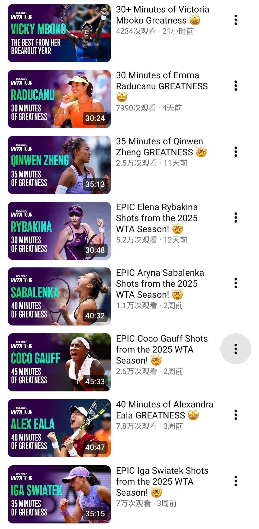 WTA是真的很用心在捧伊埃拉,与众多名将拥有一样的待遇——30分钟+个人超长集锦。不过目前她的播放量是最多的:7.8万。