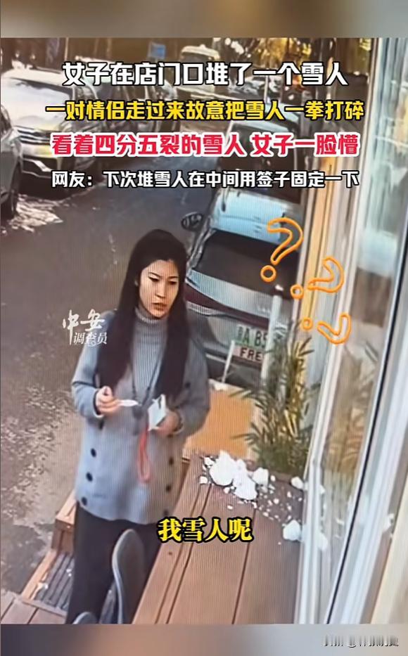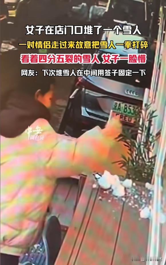 “太缺德了!”12月13日,北京,一女子趁着初雪,在店门口堆了一个可爱的小雪人,正当她进去找材料时,一对情侣路过,其中女生直接将雪人打碎,随后笑嘻嘻的走了,等女子出来后,看见四分五裂的雪人直接愣住。[尬笑] 北京初雪后一家店铺门口的监控记录下这样一幕,一位女士在窗台堆好雪人,转身进屋取装饰材料,期间一名路过的女孩伸手将雪人破坏,随后离开店主返回时,只见一地碎雪。 雪人虽不值钱,最终也会融化,但随意破坏他人劳动成果的行为令人不适,大家反感的并非雪人消失,而是其中透出的对他人心意的漠视。 有时可能出于瞬间冲动或寻求刺激,但行为者往往低估了其对他人情感的影响,法律层面亦有界定,故意损坏他人财物,即便价值不高,原则上也构成侵权,需承担相应责任。 堆雪人是大人们找回童趣的一种方式,那个被破坏的雪人,像是一个微小提醒:文明社会不仅需要法律框定底线,更离不开每个人的换位思考与对他人劳动的尊重。 当我们选择呵护而非破坏,选择路过而非插手,就是在为周遭的环境增添一份不可或缺的温度。这种温度,正是抵御冷漠、联结彼此的微小基石。 看到北京这位女士堆的雪人被路人一拳砸碎的新闻,评论区真是炸开了锅。我翻看了好多网友的留言,发现大家的观点虽然各不相同,但主要围绕这么几个方面: “最烦这种手欠的,看见什么东西都想碰一下、搞一下,完全不顾别人感受!” 虽然雪人本身不值钱,太阳一晒也会化,但它是别人花了时间、带着一份好心情精心创作的。这种随手破坏的行为,说白了就是对他人劳动成果和情感的不尊重。 “说值钱吧,它就是个雪堆的;说不值钱吧,自己花心思一点点捏出来的,就这么莫名其妙被人一拳砸没了”。 “我上次堆了个雪人,用纸扎了朵花当鼻子,一个女人直接给我拔了扔一边”。 这女孩的行为“并非无意识,更像是觉得好玩才动手”,但这种所谓的“好玩”,代价却是毁掉别人一天的好心情。 “也不能说小丫头坏,应该是玩心重,小丫头能没什么坏心思呢”,但即便出于好玩,这种建立在别人失落之上的乐趣也并不可取。 “我们常用‘熊孩子’解释这类行为,但真正需要成长的是整个社会的共情肌肉。” 一个真正文明的社会,不仅需要遵守大的规则,更体现在对这些微小、易碎的美好的呵护上。 有的社区发起了“雪人守护计划”,孩子们在堆雪人时会系上写有祝福的蓝丝带,这些行动都是在提醒大家要珍视生活中那些看似脆弱却充满温情的创造。 总的来说这个被砸碎的小雪人,引发的不仅仅是对一件具体事情的议论,更是对如何相互尊重、如何守护生活中微小快乐的一次集体思考。下次当我们想在公共场所“随手”做点什么的时侯,或许可以先多想一秒钟,自己的行为会不会无意中破坏了他人的一份好心情。 你在生活中有没有遇到过这种让人哭笑不得的“手欠”行为?或者,你有没有遇到过相反的情况——陌生人对你的某个小创作给予了意想不到的呵护,让你感到意外的温暖?欢迎在评论区分享你的故事。 信息来源:中安在线