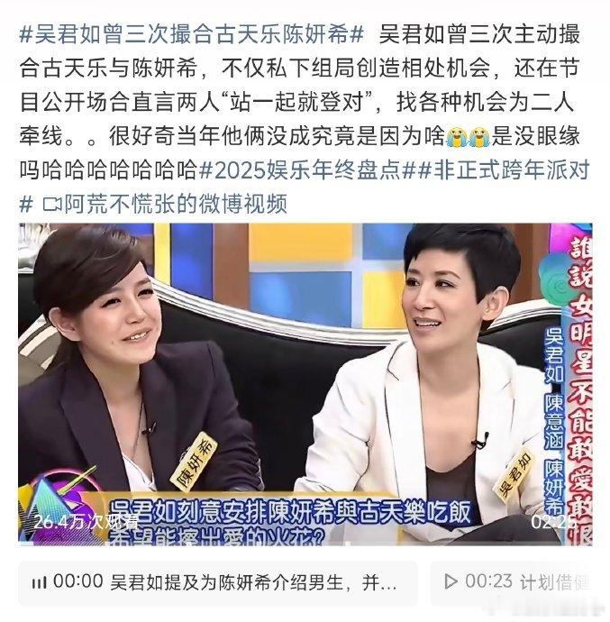 吴君如曾三次撮合古天乐陈妍希在娱乐圈这个充满奇妙故事的大舞台上,明星们的情感动态总是能吸引无数人的目光。今天咱们要聊的,就是吴君如三次撮合古天乐和陈妍希这件趣事。吴君如在娱乐圈那可是出了名的豪爽和热心肠。她就像娱乐圈里的 “月老”,时不时就想给身边的朋友牵牵红线。古天乐和陈妍希,一个是颜值与演技并存的 “男神”,一个是甜美可爱的 “女神”,如果两人能走到一起,那画面想想都觉得美好。第一次撮合,据说吴君如精心安排了一场小型聚会,把古天乐和陈妍希都邀请了过去。在聚会上,吴君如就像个专业的主持人,努力找话题让两人交流。她一会儿调侃古天乐拍戏时的趣事,一会儿又夸陈妍希的演技,就希望能让两人擦出爱的火花。可惜啊,那次聚会之后,两人并没有传出什么特别的消息。第二次撮合,吴君如可没那么轻易放弃。她又想了个办法,安排两人一起参加一个公益活动。吴君如觉得,在公益活动中,大家都怀着一颗善良的心,更容易增进彼此的了解。在活动现场,吴君如还时不时地在两人中间 “捣鼓”,一会儿让古天乐帮陈妍希拿东西,一会儿又让陈妍希给古天乐递水。可这一次,两人还是没能发展出进一步的关系。到了第三次,吴君如的热情依旧不减。她找了个机会,让古天乐和陈妍希一起参与一个朋友的生日派对。派对上气氛热闹非凡,吴君如更是忙得不亦乐乎,不停地找机会让两人互动。但最终,这段 “撮合之旅” 还是没有迎来大家期待的结果。从吴君如这三次热心的撮合中,我们也能看出她对朋友的那片真心。不过,感情这种事情,有时候真的是强求不来的。专家也说过,感情是需要缘分的,两个人能不能在一起,不仅仅是看外在的因素,更重要的是彼此的感觉和默契。就像古天乐和陈妍希,也许他们在性格、生活方式等方面并不一定那么契合,所以才没能走到一起。娱乐圈里总是充满了各种八卦和传闻,但有时候这些有趣的故事也能给我们带来一些欢乐和思考。吴君如的这三次 “红娘” 行动虽然没有成功,但却给我们留下了一段有趣的谈资。说不定在未来的某一天,古天乐和陈妍希会各自找到属于自己的幸福,而吴君如也会继续她那热心肠的 “撮合大业”。你怎么看待吴君如的这三次撮合呢?是觉得她太热心了,还是觉得也许他们之间真的有缘无分呢?欢迎在评论区留言分享你的看法!