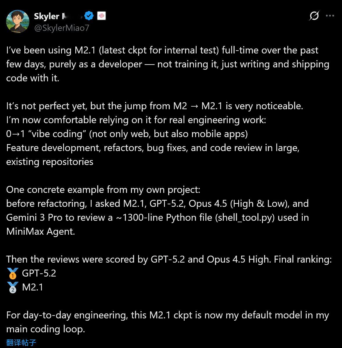 MiniMax M2.1的爆料,估计快发了。“从 M2 到 M2.1 的提升肉眼可见。 我现在已经可以很放心地依靠它来处理实际的工程任务”图2是用各个大模型对Python文件做review ,然后让GPT-5.2 和 Opus 4.5 High对review 结果评分, M2.1 已经超过 Opus 4.5 High (当然只是一个例子)。科技先锋官AI创造营
