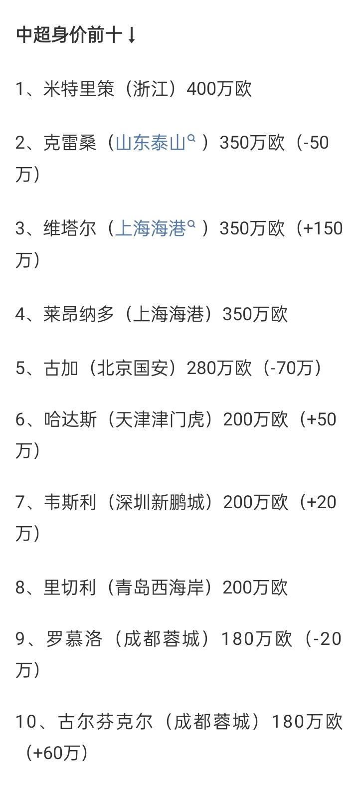 中超球员身价更新!米特里策400万欧第1蒋圣龙涨至100万王钰栋同为150万