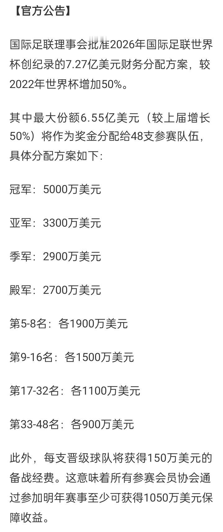 官方:2026美加墨世界杯总奖金为7.27亿美元 冠军奖金5000万 亚军3300万美元 季军2900万美元 12月17日 官方消息,国际足联批准了2026美加墨世界杯的奖金总额7.27亿美元,较2022年增加50%,冠军将获得5000万美元,亚军3300万美元 季军2900万美元!此外,每支晋级球队将获得150万美元的备战经费!参赛球队至少可获得1050万美元保障收益