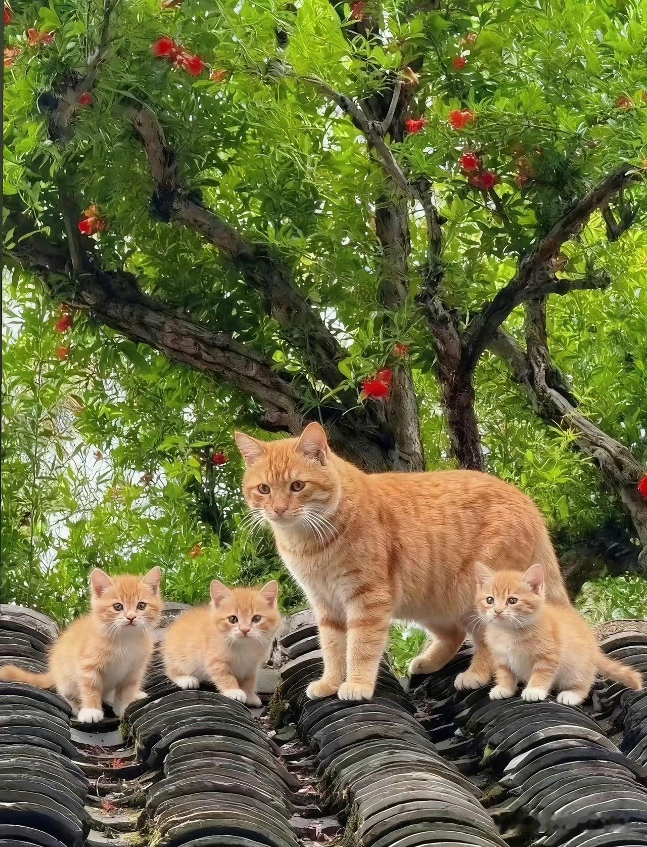 石榴树下的老瓦檐,是橘猫妈妈的“育儿小天。