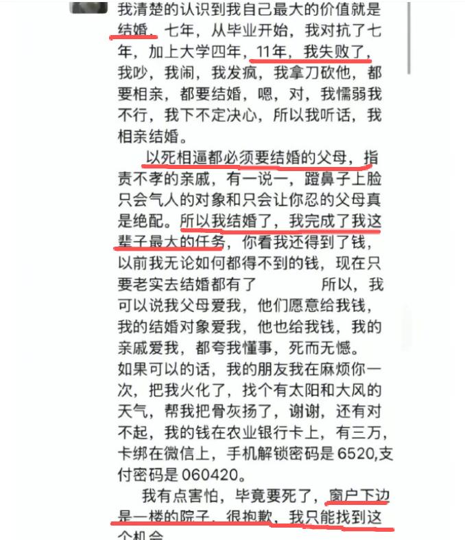 女教师在结婚当天坠楼身亡,逼婚下的悲剧还在上演! 2025年12月10日,是高中女教师魏某结婚的日子,这本来是一件非常高兴和值得庆祝的事,但却因为新娘子坠楼,而变成了一起悲剧。 魏某是鲁山县重点高中的历史老师,当年应聘岗位时,以笔试和综合成绩第一的名次,应聘到了县重点高中的历史老师。 根据其学生的回忆,魏老师和蔼可亲,从不把情绪带到课堂上来,而且教学很有方法,曾经让一个差班挤进年级前列。 而就是这样一位优秀的老师,却遭受了长达11年的催婚,从17岁开始,她就被家人无数次逼婚,最终导致了这起悲剧的发生。 工作的这几年,魏某得工资卡被其母亲控制,每月就给魏某500元生活费,剩下的全部没收,这个时代还有这样的家人?也是魏某的悲哀呀。 持续的催婚,最终让魏某妥协了,她开始相亲、然后结婚,但这一切都不是她自愿的,结婚收的彩礼钱,都被安排给她的弟弟结婚了。 就在结婚当天,当她坐着婚车被接到男方家中时,她以需要换衣服为由,把自己锁在了位于7楼的房间内。 然后就是这个时候,她写下了她的遗书,她把这么多年的委屈全部写了出来,自己以死相逼却还逃不过父母逼婚,亲戚也是冷眼相催,她说这次结婚,是她完成了这辈子最大的任务....... 她跳楼前还担心会对一楼的住户产生影响,但她在遗书中叙述,这也是自己最后和仅有的机会了....... 写完遗书发到朋友圈,然后就决然的从7楼跳下,尸体落入了一楼其他住户的院子里。 悲剧发生后,更可悲的事情还在持续中。 魏某的家人以魏某已经加入到了男方家中,出现这样的事情该由新郎负责。 而对于男方家,称魏某还没有拜堂,这种事情该女方负责。 就这样双方推诿,导致魏某的遗体在一楼园内停留了很久,真的是人性的冷淡呀。 而后男方家让退还27万的彩礼钱,更是把人性的冷淡表现的淋漓尽致! 事后,一楼的住户因为尸体落在了自己家里,给自己家里带来了很大的影响,遂向涉事双方提出了赔偿,这也是合情合理的诉求,最终以3万元达到了和解。 催婚这个传统的陋俗,早已经被取缔,可还是会因为催婚出现这样的悲剧。 婚姻并不是必选题,每个人都有自己的婚姻自由,这应该得到父母和家人的尊重,毕竟生命比什么都重要。 幸福的人生才是人生的追求,一味的逼迫去干一些事情,只会让事情向着反的方向发展。 就是这样一位优秀的教师,在不为学生所知的一面中承受着无穷的压力,但在课堂上,她依然是一位和蔼的老师,没有把生活中的坏情绪带到课堂上,这是非常值得尊敬的。