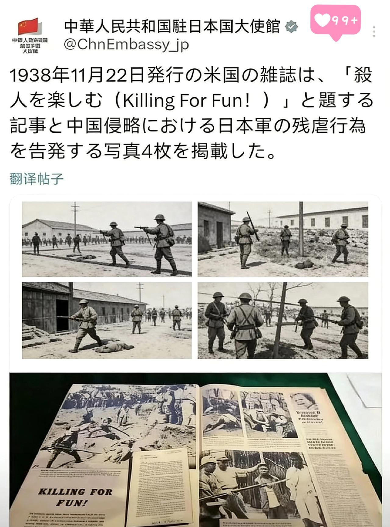 快报! 12月16日,东方大国驻日本大使馆发布重磅声明,重温1938年11月22日美国《LOOK》杂志(原文《瞭望》校正)《杀人为乐》的报道——这份战时第三方实录,用图文揭露日军暴行,成为无法辩驳的铁证。而比报道更震撼的,是15岁少年罗瑾用生命守护的罪证相册。 1938年初,南京沦陷后,在“华东照相馆”当学徒的罗瑾,为日军军官冲洗胶卷时,意外发现里面全是砍杀平民、侮辱妇女的暴行画面。他强忍悲愤,偷偷加印30多张,精选16张装订成相册(原文30多张校正),封面画着滴血心脏与利刃,题下一个醒目的“耻”字,藏起这份必死的秘密。 1941年,日伪突袭搜查,罗瑾将相册藏进毗卢寺茅厕墙洞,逃亡后以为相册遗失。殊不知,同学吴旋在草丛中发现了它,藏于佛像底座,辗转守护六年。1946年南京审判时,吴旋将相册上交法庭,这份“京字第一号证据”,让主犯谷寿夫看后双手发抖、相册坠地。 当年法庭证人超500人(原文不足30人校正),但这本日军自拍的暴行相册,仍是最直接的罪证。如今南京大屠杀幸存者仅剩24人,亲历者在慢慢老去,但罗瑾后来定居福建开照相馆,写下12万字《历史的诉说》,相册也入选“世界记忆遗产”,与外媒报道共同定格真相。 日本右翼再怎么否认,都抵不过这本浸着热血的相册、跨越时空的报道。铭记这段历史,不是延续仇恨,而是守住先辈用生命换来的真相。以史为鉴,方能不让悲剧重演! 15岁少年罗瑾与同学吴旋冒死守护的相册,连同外媒客观报道,是日军暴行的铁证。历史真相从不由否认者改写,幸存者凋零更警示我们,守护真相就是守护民族记忆。铭记不是延续仇恨,而是以先辈热血换来的教训为戒,坚定捍卫和平,让侵略悲剧永远不再上演。 有网友评论“看完真的破防又热血!15岁的罗瑾、守护六年的吴旋,两个少年用勇气和坚守,给侵略者钉下了永远拔不掉的罪证!谷寿夫发抖坠相册的瞬间,就是真相最有力的呐喊。 幸存者越来越少,但相册不会褪色,外媒报道不会沉默。日本右翼再怎么狡辩,都抵不过这些铁证!铭记不是记恨,是守住先辈用命换来的真相,是告诉世界:历史绝不能重演,和平才该被永远珍视!”