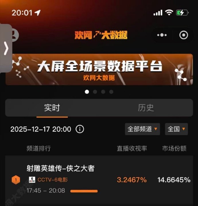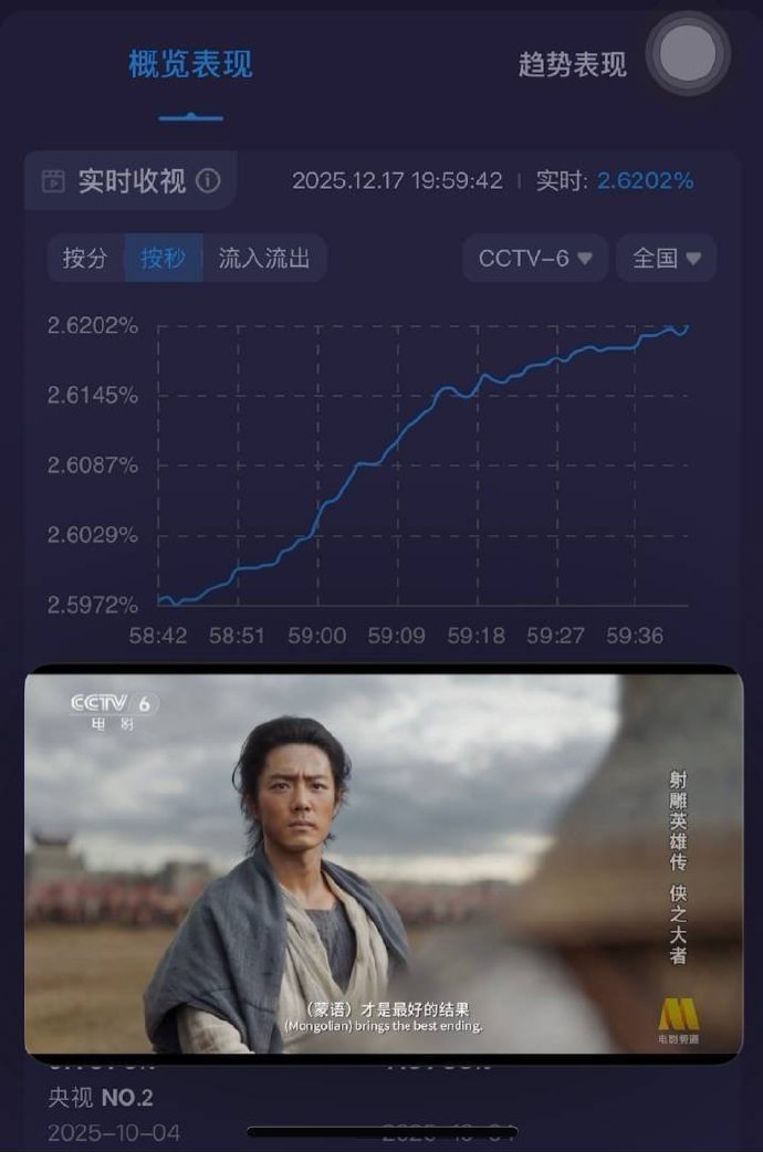 肖战主演的《射雕英雄传之侠之大者》没提前预告,空降CCTV6,在12月17日,周三,17:45分播出,取得酷云2.6,欢网3.2的收视好成绩,真是非常牛了。讲真,在工作日,晚饭点,很多人包括粉丝都不知道的情况下,取得如此高的收视,殊为不易,怕是打开电视看到的人都为这部电影驻足的节奏,无论你在干什么,看到了就忍不住为它停下脚步,停下手中的事情,好电影就是有这种魅力!