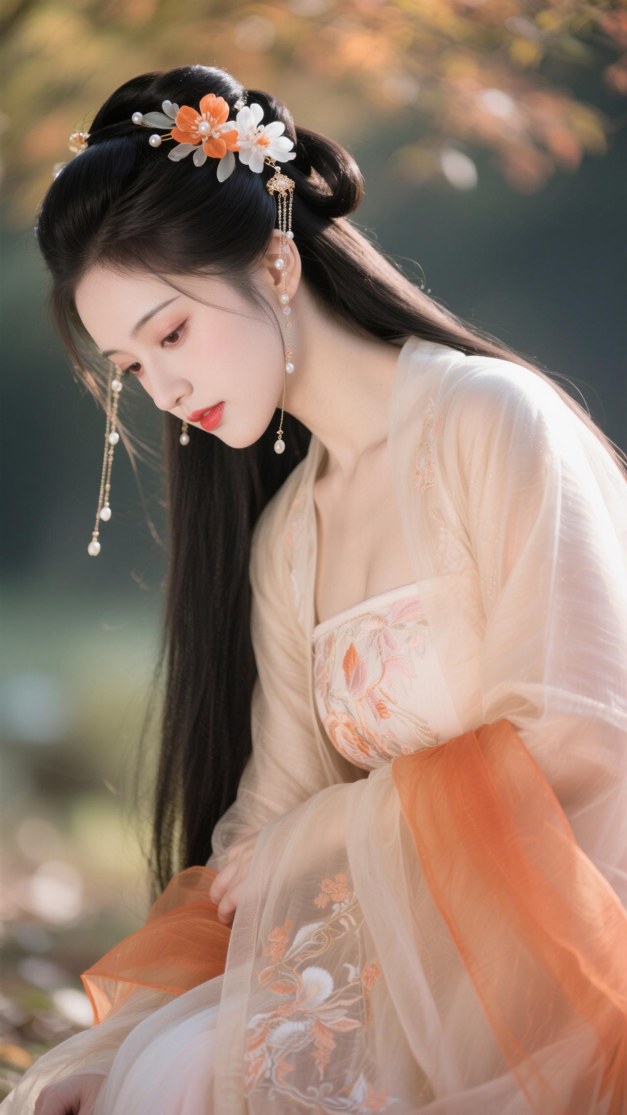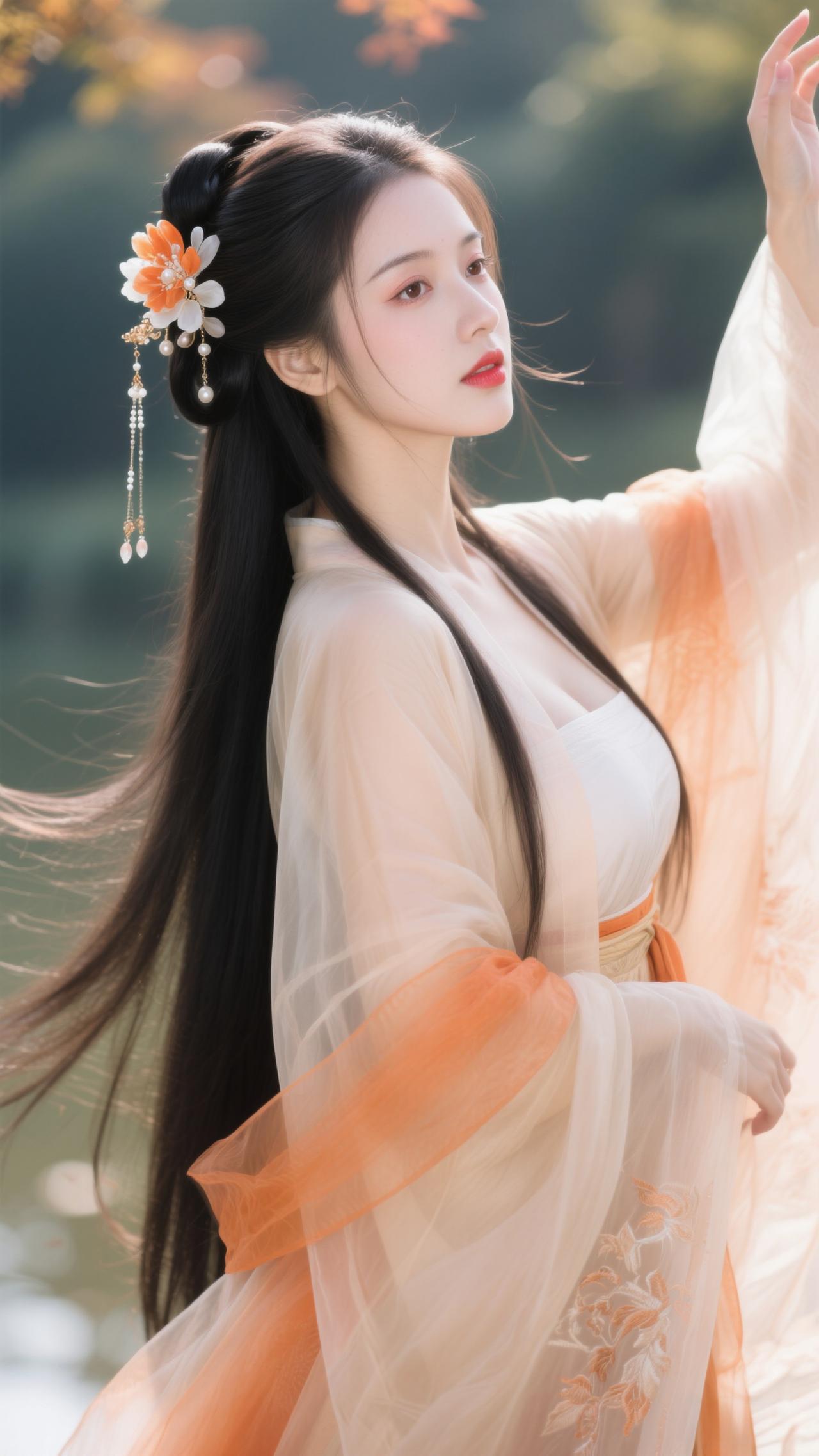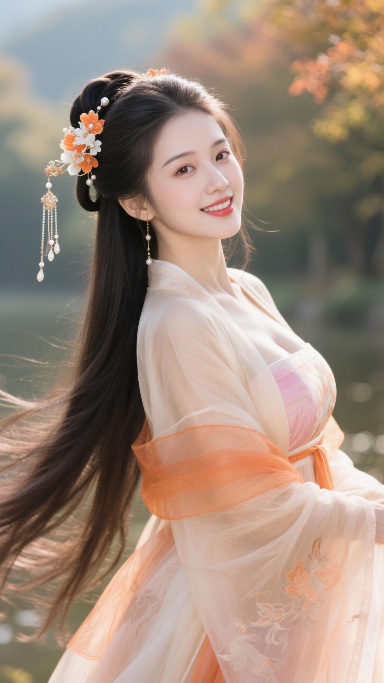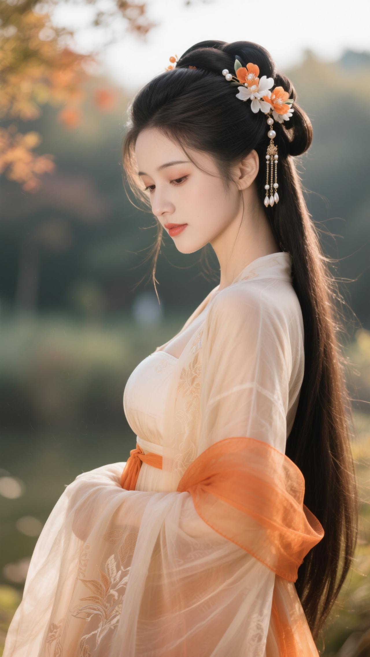 《诉衷情·秋林簪橙》 橙绡轻挽杏罗衣,簪花映夕晖。 发丝漫卷秋风软,眉底藏清辉。 波影静,树影微,意迟迟。 一襟香浅,半袖秋光,笑对寒漪。
