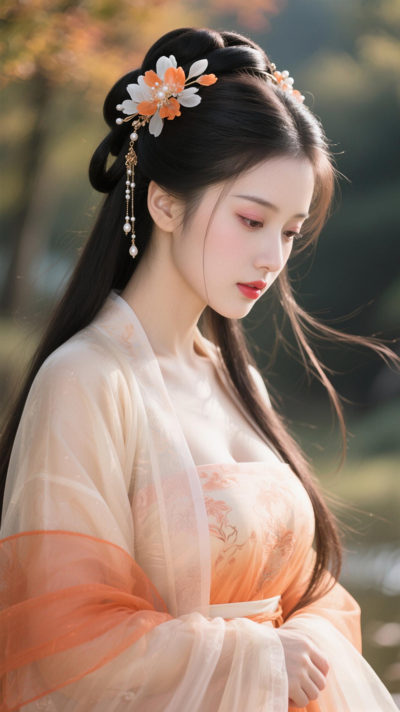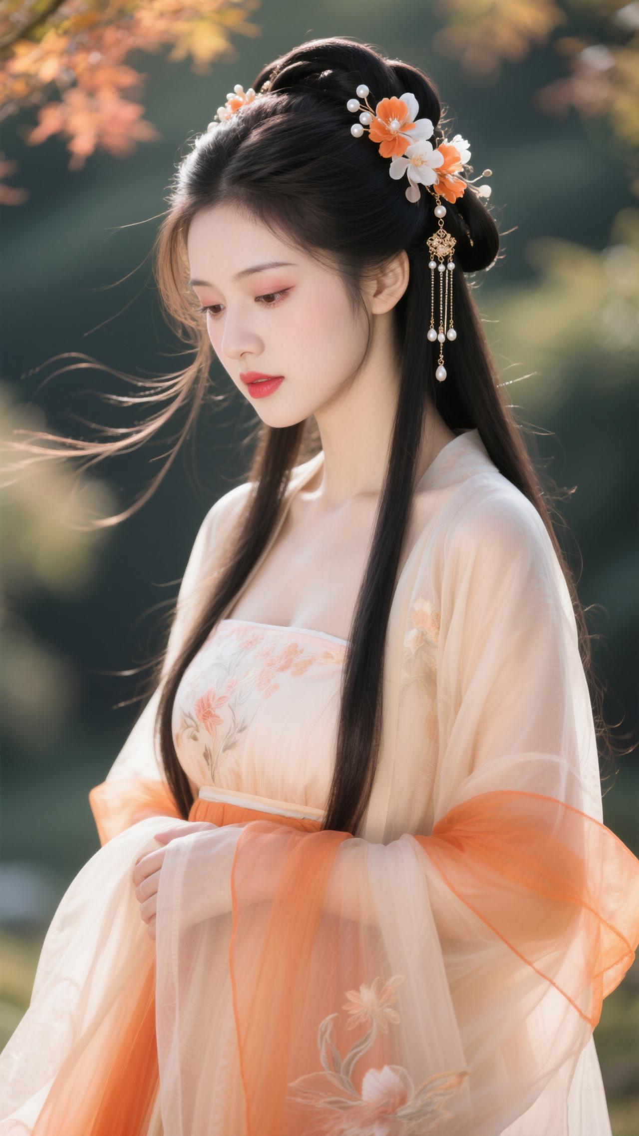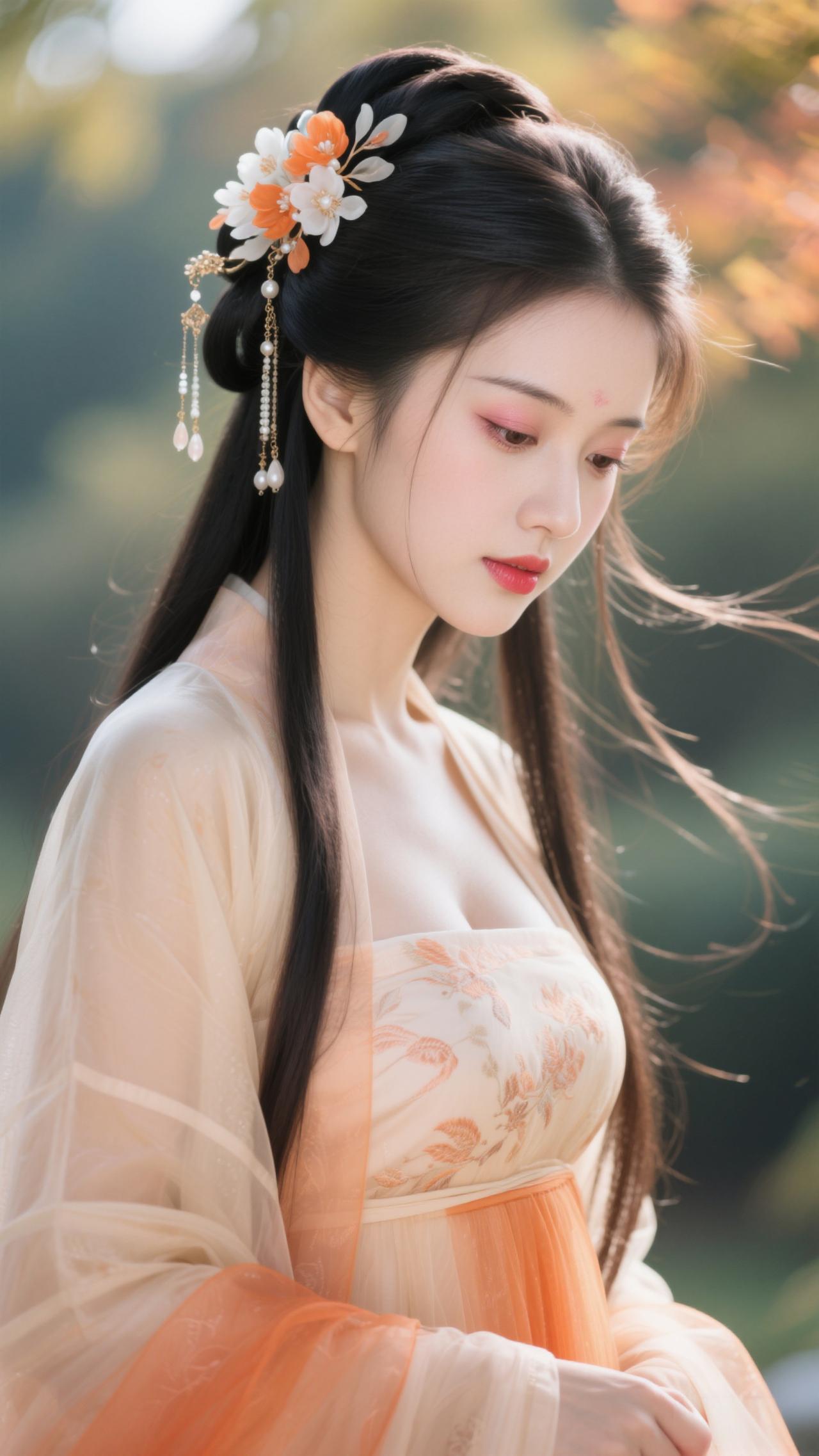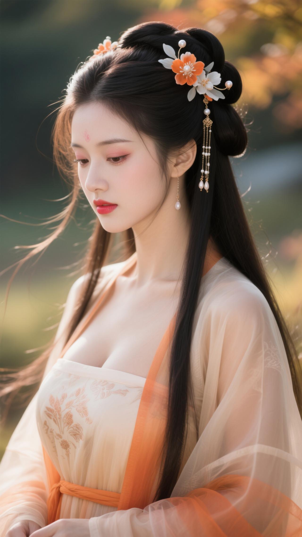 《诉衷情·秋林簪橙》 橙绡轻挽杏罗衣,簪花映夕晖。 发丝漫卷秋风软,眉底藏清辉。 波影静,树影微,意迟迟。 一襟香浅,半袖秋光,笑对寒漪。