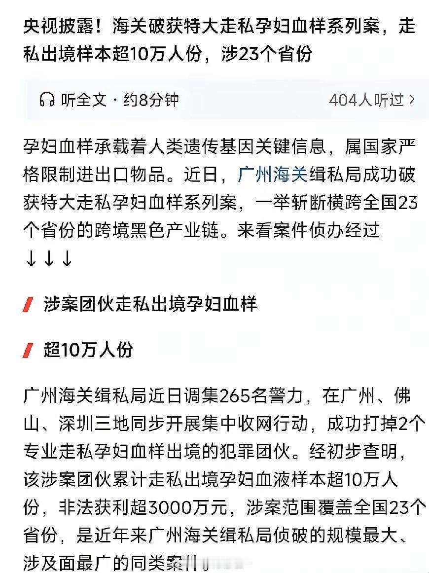 海关查获走私中国人血液样本10万余份,走私分子已获利3000万元。走私中国人血液样本竟然形成了一个完整的利益产业链!国外利用中国人的基因密码研制生化武器!国外这已经开始对中国人的基因下手啊!一些人为了个人利益,出卖集体利益,真是罪该万死,是可忍孰不可忍,必须得严惩,要让这种人感觉到痛才有可能收手,千万不要搞一些不痛不痒的处罚!