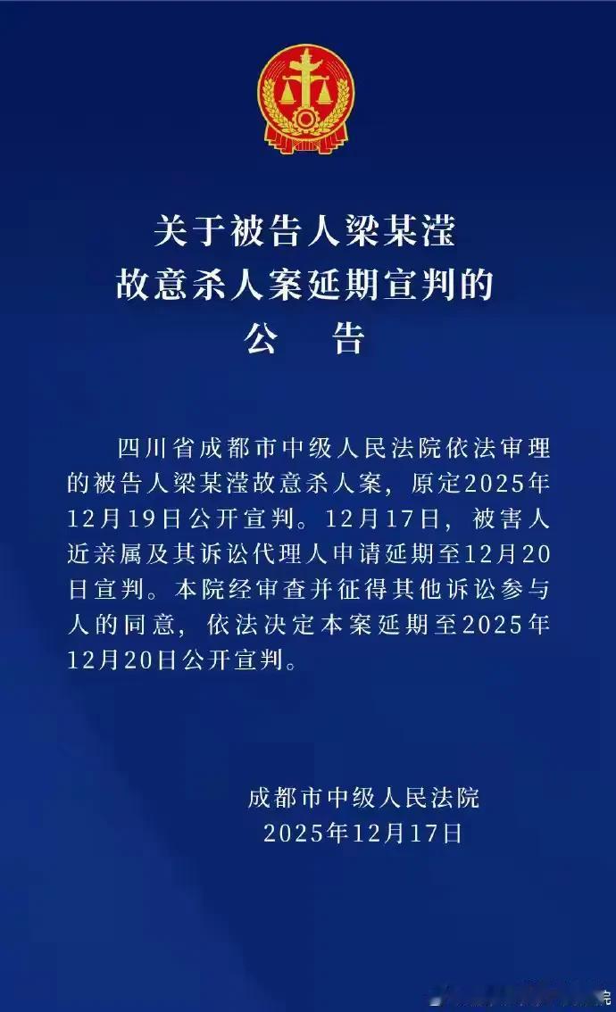 快讯!宣判时间再次延期,原定于12月19日宣判的成都女子家门口遇害案,被害人亲属申请延期到20日宣判,成都中级人民法院同意申请。 据了解可能是王某雅母亲和律师还在加紧时间整理材料和核实梁某滢的精神鉴定报告内容疑点,用于后续抗诉判决结果和请求死刑判决的证据,因此申请延期一天。 不过按照以往情况,此案一定会在一审判决公布后,由被告或者原告再次要求二审,最终结果会由四川省高级人民法院做出最后的终审判决。因为被判死刑那么被告一定会不服,而判处无期徒刑那么原告方一定不会同意。 成都女孩遇害案 成都女孩家门口遇害案再次延期宣判