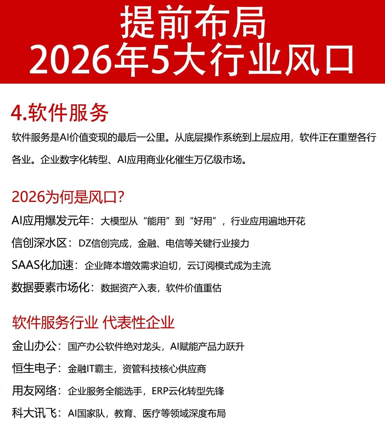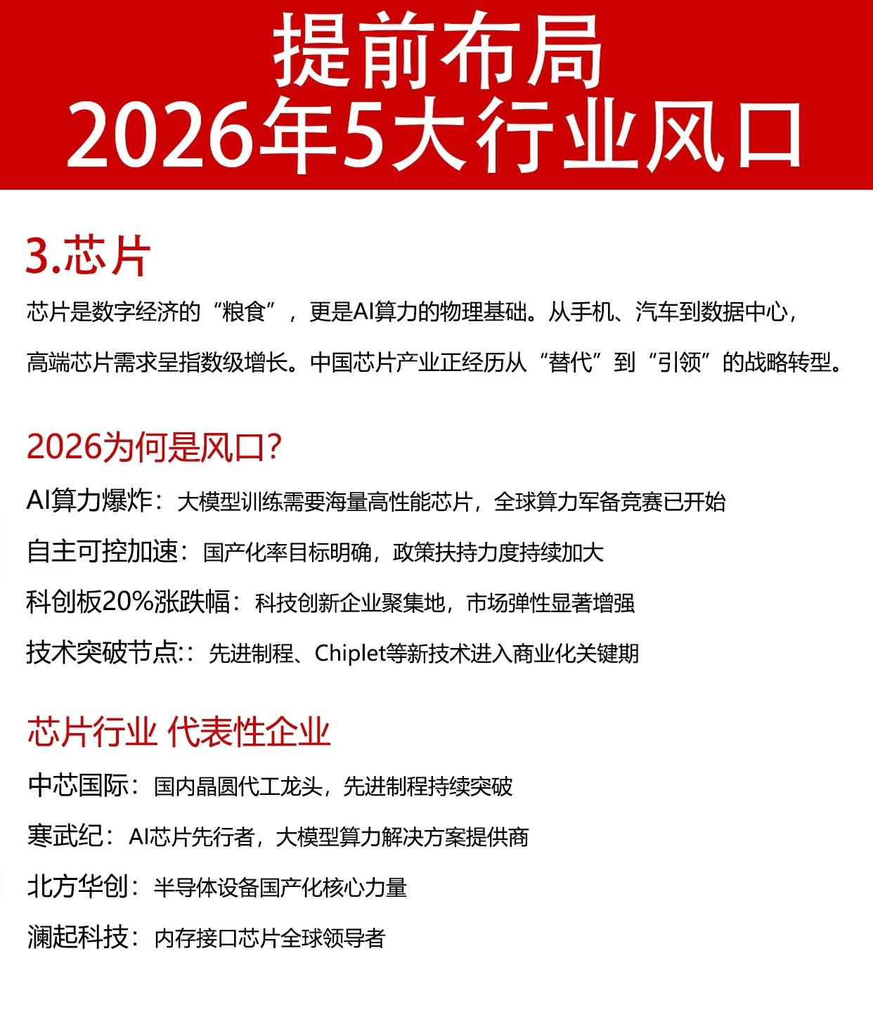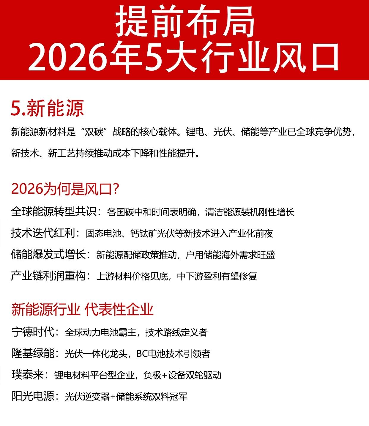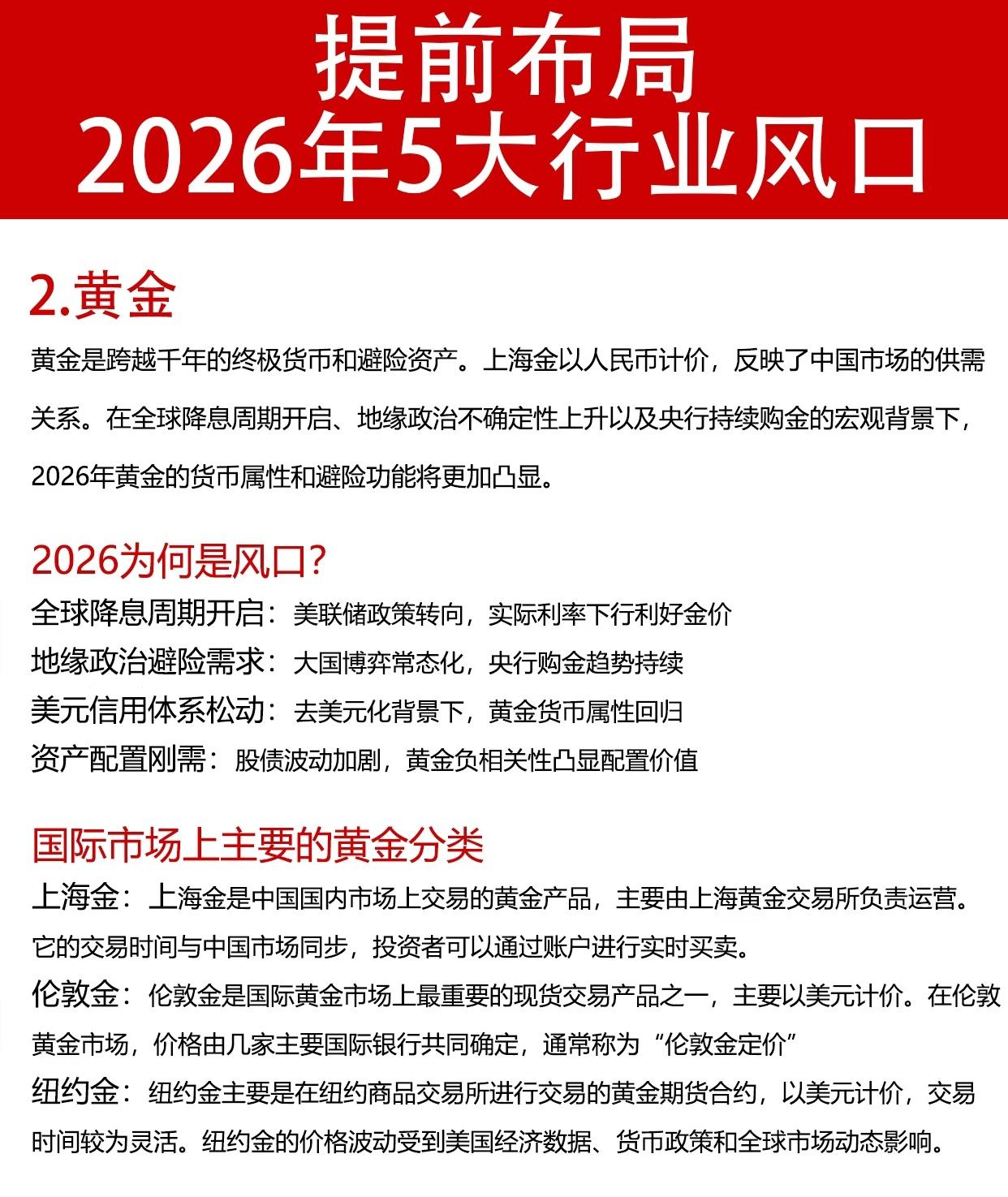 2026年五大行业风口及相关要点如下: 1. 稀土 稀土是17种稀有金属的统称,被誉为“工业维生素”,是现代高科技产业尤其是永磁材料、军工装备不可或缺的战略资源。2026年成为风口的原因包括:我国稀土出口管制常态化,定价权增强;新能源车、风电对稀土永磁材料需求刚性;军工现代化加速,在精确制导、隐身技术等方面不可替代;中国掌控全球稀土冶炼分离90%以上产能。代表性企业有北方稀土(全球最大轻稀土供应商)、中国稀土(中重稀土整合平台)、金力永磁(新能源车磁材核心供应商,绑定特斯拉)、中科三环(稀土永磁老牌企业,技术深厚)。 2. 黄金 黄金是跨越千年的终极货币和避险资产,上海金以人民币计价,反映中国市场供需。2026年成为风口源于:全球降息周期开启,实际利率下行利好金价;地缘政治不确定性推升避险需求,央行持续购金;美元信用体系松动,黄金货币属性回归;资产配置刚需,股债波动下黄金负相关性凸显价值。国际市场主要分类有上海金(人民币计价,中国市场交易)、伦敦金(美元计价,国际现货定价)、纽约金(美元计价期货,受美国经济与政策影响)。 3. 芯片 芯片是数字经济的“粮食”和AI算力的物理基础,中国芯片产业正向“引领”转型。2026年成为风口的原因包括:AI算力需求激增,全球算力竞赛启动;国产化率目标明确,政策扶持强劲;科创板涨跌幅放宽至20%,增强市场弹性;先进制程、Chiplet等关键技术进入商业化关键期。代表性企业有中芯国际(晶圆代工龙头)、寒武纪(AI芯片先行者)、北方华创(半导体设备国产化核心)、澜起科技(内存接口芯片全球领先)。 4. 软件服务 软件服务是AI价值变现的最后一公里,能重塑各行业,催生万亿级市场。2026年成为风口因:AI应用从“能用”到“好用”,行业应用爆发;信创进入深水区,金融、电信等关键行业接力推进;SAAS化加速,云订阅成主流降本增效模式;数据要素市场化,数据资产入表带动软件价值重估。代表性企业有金山办公(国产办公软件龙头,AI赋能)、恒生电子(金融IT霸主)、用友网络(企业服务全能,ERP云化先锋)、科大讯飞(AI国家队,深耕教育医疗)。 5. 新能源 新能源是“双碳”战略核心载体,锂电、光伏、储能具全球竞争优势,新技术推动成本下降与性能提升。2026年成为风口的原因包括:全球能源转型共识明确,清洁能源装机刚性增长;固态电池、钙钛矿光伏等新技术进入产业化前夜;储能因政策与海外需求爆发式增长;产业链利润重构,上游材料价见底,中下游盈利有望修复。代表性企业有宁德时代(全球动力电池霸主)、隆基绿能(光伏一体化龙头,BC电池引领)、璞泰来(锂电材料平台,负极+设备双轮驱动)、阳光电源(光伏逆变器+储能双料冠军)。