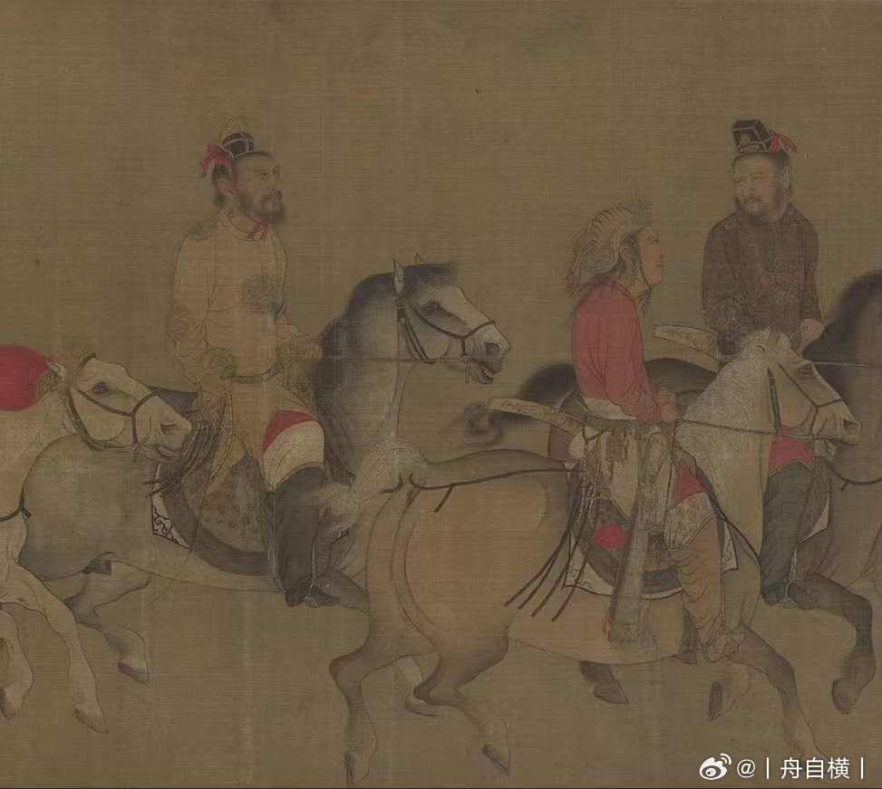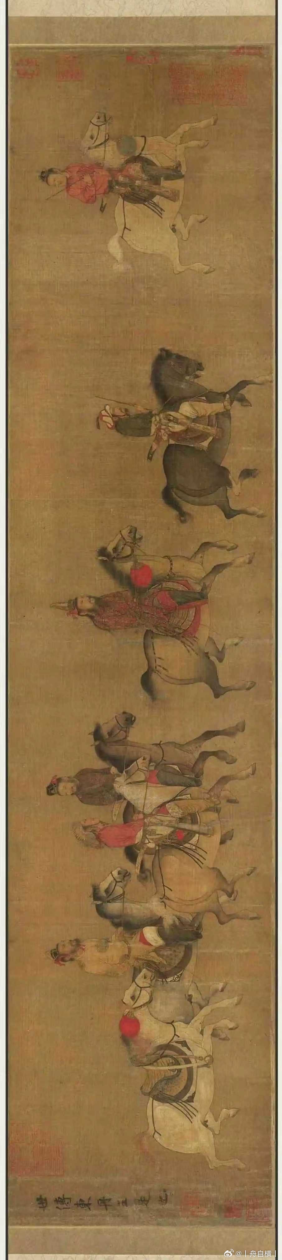 耶律阿保机长子——画家李赞华《东丹王出行图》是一幅流传于世的辽代绢本设色手卷,纵27.8厘米,横125.1厘米,现藏于美国波士顿艺术博物馆。该作品是表现人物鞍马题材的古典绘画精品,描绘了六人七马悠然前行的场景。画面中人物姿态生动,或瞻望、或顾盼、或交谈,衣冠服饰因身份差异而各有不同。中心人物东丹王耶律倍身着红色鸾凤龟纹袍,头戴高冠,骑马执缰,面容忧郁凝重,其神态可能与作者弃辽投后唐的境遇相契合。马匹造型丰肥矫健,每匹马耳部均有豁口,体现了游牧民族马耳剪口的习俗。整体构图疏密有致,色彩华丽典雅,线条细腻流畅,形成了行进的韵律感。东丹王即耶律倍(899-937),契丹名突欲,辽太祖耶律阿保机长子,封东丹王。后投奔后唐,受赐姓名李赞华,意为"赞慕中华"。他精通音律、医药,工于辽汉文章,是促进契丹与汉文化融合的重要人物。此画卷末题有"世传东丹王是也"字样,但学界对作者归属仍有讨论,有研究认为其画风更接近北宋院画,可能与擅长"犁鼻裂耳"技法的画家张戡有关。