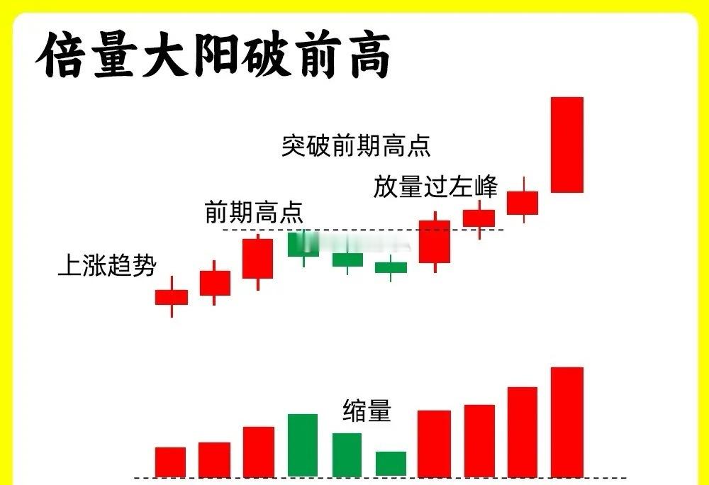 注意了!这个是一个上涨趋势里,最为常见的一个强势形态,这是典型的主力吸筹洗盘的一个过程,而且很好分辨。这个形态就是倍量大阳过前高,有人它放量过左锋。这是技术分析里,比较重要的一个形态,我总结了几个核心要点,新手小白也能轻松看懂还是老规矩,点赞收藏或评论六六六支持一下,大A每天分享炒股干货,以免以后想温习找不到了1.这个形态一般出现上涨趋势的初期,或是股价在低位横盘阶段,倍量启动的阶段。2.这个的核心在意倍量和大阳线。股价经过小幅度的上涨以后,形成一个前期的高点,随后股价开始回落,成交量出现大幅的缩量3.随后股价出现放量,成交量是平日的两倍以上,我们称为是倍量,大阳线的涨幅一般会大于5%以上,突破前期波段的高点,这个有一个细节,就是收盘以后,股价要站稳前期高点的1个点左右,如果是小盘股可以小一点。、4.这样形态出现,说明主力已经控盘,主力的意图是强势的,为什么这么说,前期高点,在回调过程里,就形成一个套牢盘,主力如果不强势,不承接这些套牢盘,就很难突破这种重要压力位。一旦有效突破,那就是天高任鸟飞。好了,以上就是倍量大阳过左锋形态,在上涨趋势的初期,出现的比较多,了解这个模型,吃透它,说不定哪天就可能用的上。希望对大家有启发和帮助,也是最为基础的内容,一定吃透。