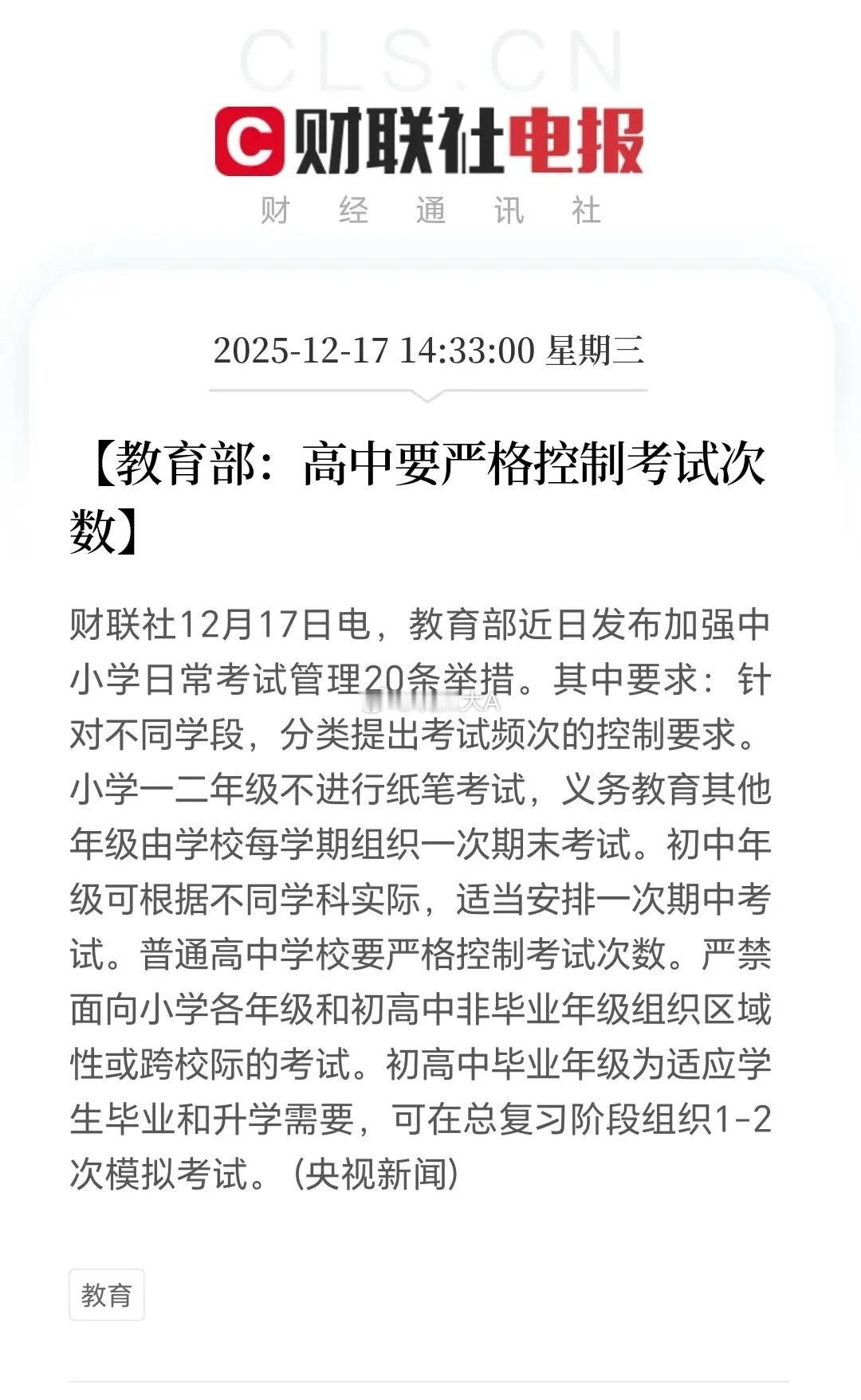 教育部发话了:小学一二年级不进行纸笔考试、其他年级每学期一次期末考试,初中适当安排一次期中考试,普通高中严空考试次数……其实,很多学校还做不到。月考,期中考,期末考,大考,小考…