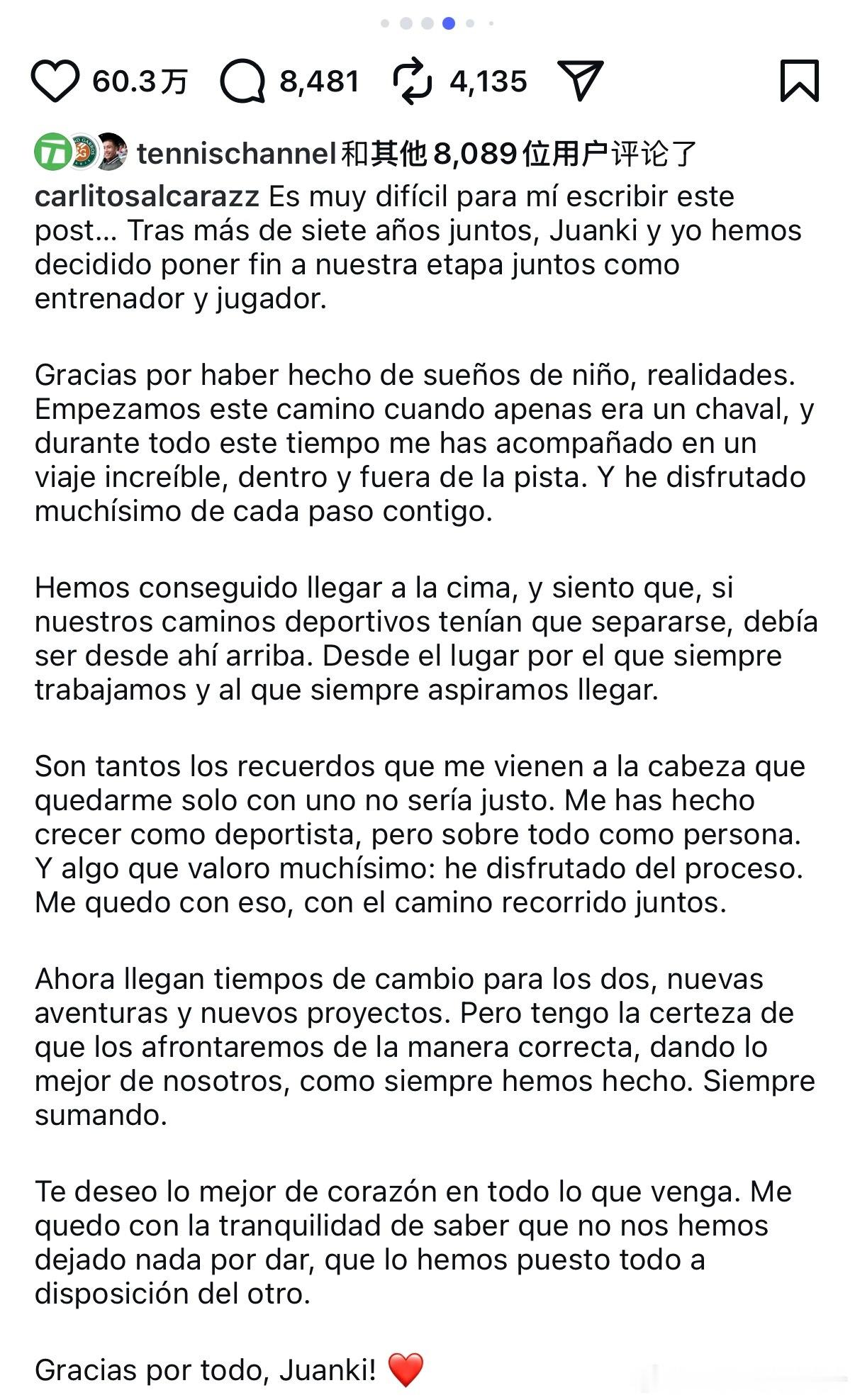 阿尔卡拉斯费雷罗结束合作🇪🇸阿尔卡拉斯发长文感谢恩师的尊尊教诲🔥“写这篇文章对我来说非常困难......在共同度过七年多之后,胡安基和我决定结束作为教练和球员的合作。谢谢你让我儿时美梦成真,我们从我还是个孩子的时候就开始了这段旅程,在这段时间里,你陪伴我走过了一段不可思议的旅程,无论是场上还是场下。我非常享受和你在一起的每一步。我们成功登上了顶峰,我觉得如果我们的运动道路必须分开,那也一定是从高处开始。从那个我们一直为之奋斗,永远向往的地方出发。回忆太多,只选一个不公平。你让我成长为运动员,更让我作为一个人成长。还有一件我非常珍视的事:我很享受这个过程。我接受这条共同走过的道路。现在,他们俩都迎来了变化的时刻,新的冒险和新的项目。但我相信我们会以正确的方式面对它们,像往常一样,全力以赴。总是在加起来。我衷心祝愿你在未来的一切中一切顺利,我能安心的是,我们毫无保留,已经为对方提供了一切。谢谢你做的一切,胡安基!❤️”很美妙的合作,㊗️双方都好👌🏻网球talking大会