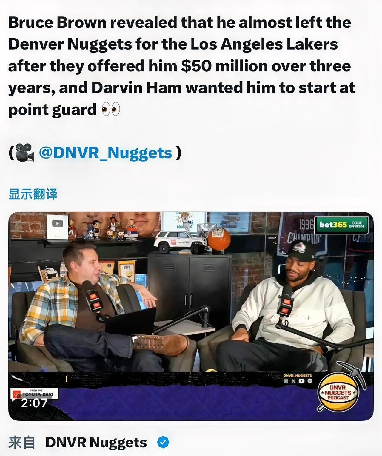幸好没来湖人!布鲁斯·布朗如今的状态下滑肉眼可见,回看当初的签约风波更觉庆幸。 掘金后卫布鲁斯·布朗爆料,掘金夺冠后湖人曾向他递上3年5000万的合同,主帅哈姆更是有意让他担任首发控卫。不过最终他选择另辟蹊径,以2年4500万的合同加盟步行者。#布鲁斯布朗# #NBA睿闻#