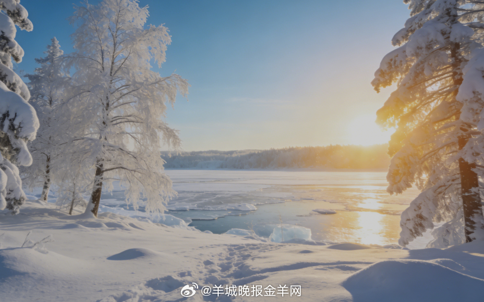 早安 清晨的冰天雪地,地面覆盖厚厚的白雪,冰封的湖面和积雪的树木,朝阳金色的光芒洒在雪地上反射出耀眼光芒,天空湛蓝,又是一个美好的早晨~早安~