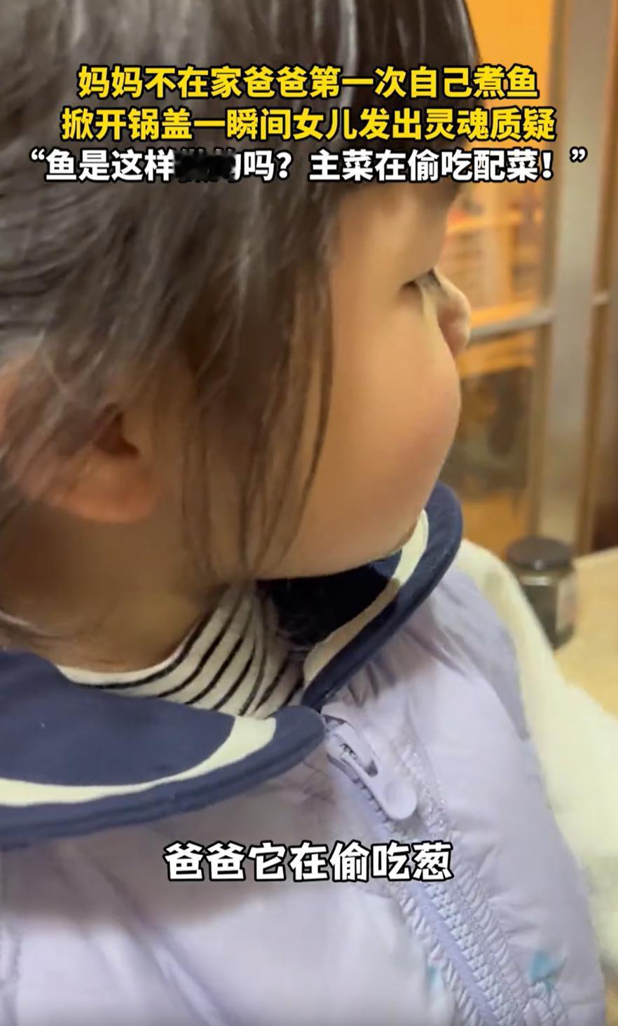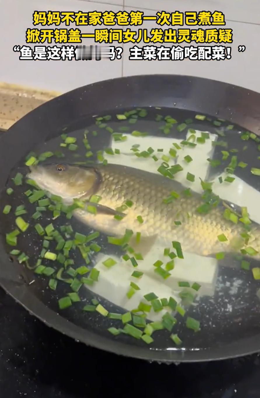 “一个敢问,一个敢答!”浙江,妈妈没在家,爸爸第一次下厨给女儿煮鱼吃,万万没想到,盖子掀开后,女儿看到锅里的鱼直接就懵了,询问爸爸说:鱼是这样做的吗?等爸爸回头一看,才发现锅里的鱼竟然在吃葱花。网友:打一个食材新鲜 那天妈妈不在家,厨房大权就落到了爸爸手里。他决定给女儿露一手——煮条鱼吃。女儿一听爸爸要下厨,好奇地跟进了厨房,想看看今晚到底能吃到什么 爸爸显然平时很少掌勺,动作生疏得很。他从冰箱拿出鱼,洗了洗,就直接整条放进了锅里。接着倒上大半锅水,扔了几块豆腐进去,最后抓了把葱花撒在上面,盖上了盖子 女儿盯着锅看,越看越觉得不对劲。她忍不住问:爸爸,鱼是这样做的吗?怎么和妈妈做的不一样啊 爸爸也有点含糊,嘴上说着能熟就行,心里其实也没底。这时候,女儿突然凑近锅边,惊呼起来:爸爸!鱼在吃葱! 原来水滚之后,鱼身在锅里翻动,那张开的鱼嘴正好凑在漂浮的葱花旁边,随着水波一张一合,乍一看还真像在吃葱花。爸爸连忙把锅盖扣紧,场面一时有点手忙脚乱 有网友说:你这没杀过猪,但你总看过猪跑吧,没做过鱼总看过做鱼吧?起码内脏取出啊,活鱼直接煮厉害 其实生活中很多爸爸都是这样,平时可能很少下厨,真到了需要他们做饭的时候,办法虽笨,但心意是实的。他们或许不懂什么烹饪技巧,但愿意为了孩子去尝试,哪怕闹出笑话,也是一份很朴素的付出 很多人看完会笑,说这是食材太新鲜。笑过之后其实挺暖的。爸爸愿意做,孩子敢问,这种场景本身就很难得。比起一桌卖相完美的菜,这种笨拙更有记忆点。孩子以后记住的,未必是这条鱼的味道,而是有一天,爸爸站在灶台前,被自己做的饭整不会了 爸爸第一次煮鱼 主菜在偷吃配菜