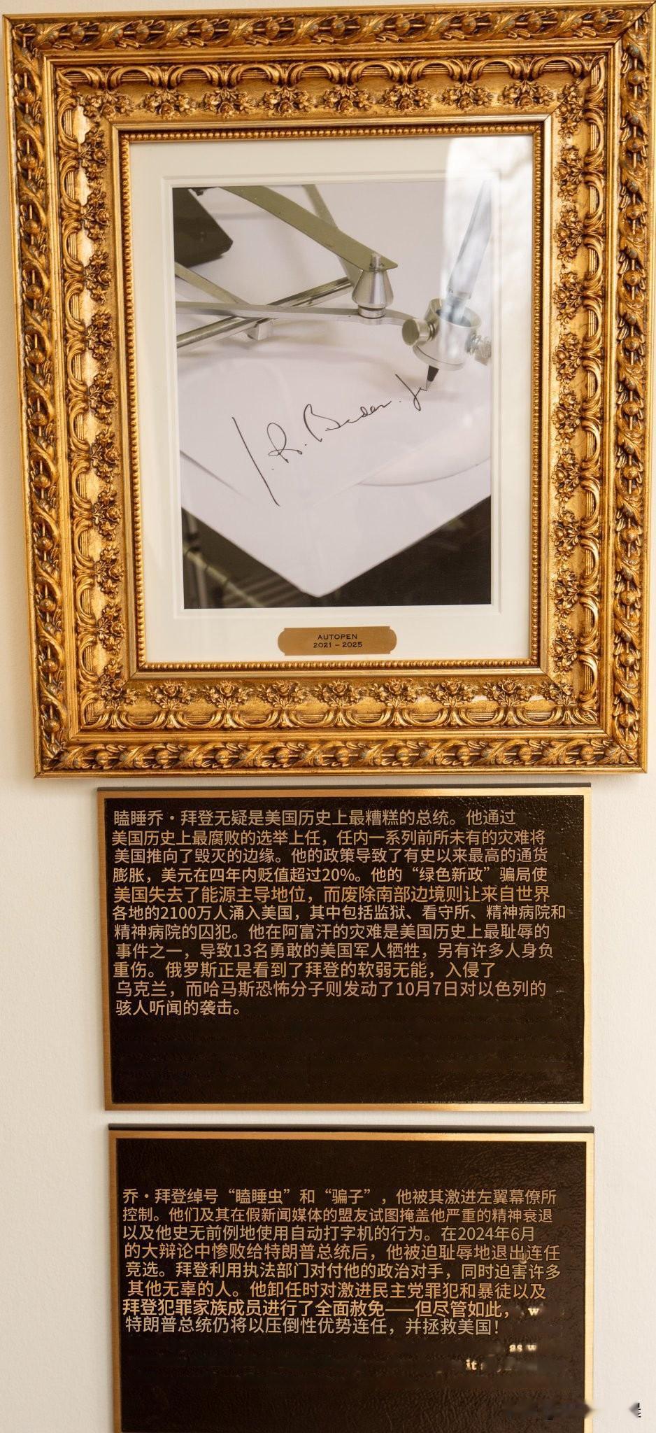 白宫玫瑰园旁的总统名人墙彻底打破传统!作为肯尼迪时期定型的官方仪式地标,这片本应庄严肃穆的区域,如今因新增的介绍文字沦为舆论焦点,字里行间满是尖锐的谩骂与直白的吹捧,将美国政治分裂赤裸裸地公之于众。 据美国媒体报道,这面被特朗普称为“总统星光大道”的名人墙,对前总统拜登的描述堪称辛辣——不仅用自动签字笔图片替代其肖像,文字更直接将其定义为“美国历史上最糟糕的总统”,指控其通过“最腐败的选举”上台,导致国家濒临毁灭。针对奥巴马的介绍同样充满敌意,称其为“最具争议的政治人物”,批评奥巴马医改“极其无效”,还暗指其曾监视特朗普2016年竞选活动。 与之形成鲜明对比的是对特朗普本人的吹捧:文字大肆宣扬他2024年胜选“克服了暗杀未遂与执法武器化打压”,宣称其执政11个月就“兑现就职承诺,开启美国黄金时代”,字里行间尽显自夸色彩。更具讽刺意味的是,连克林顿的介绍都夹带私货,特意提及“其妻子希拉里2016年输给特朗普”的细节,政治挑衅意味十足。 要知道,白宫总统肖像向来遵循 bipartisanship 传统,揭幕仪式常是跨党派友好交流的场合。如今特朗普政府却将这一公共空间改造为政治攻击工具,用“非人化”嘲讽与片面吹捧重构历史评价,难怪引发民主党强烈抗议,连国际舆论都批评此举“反美国精神” 。
